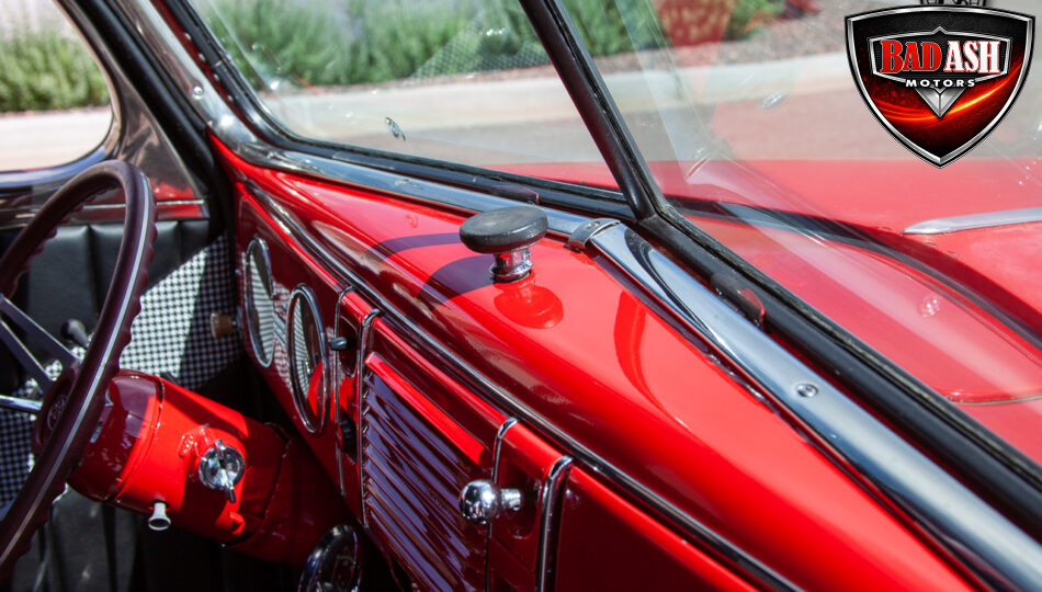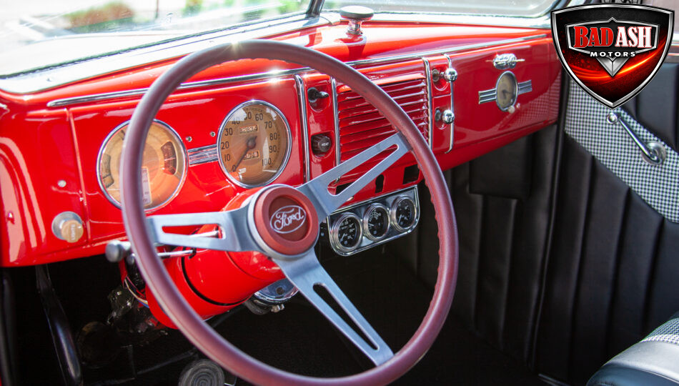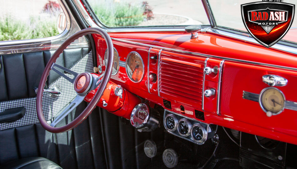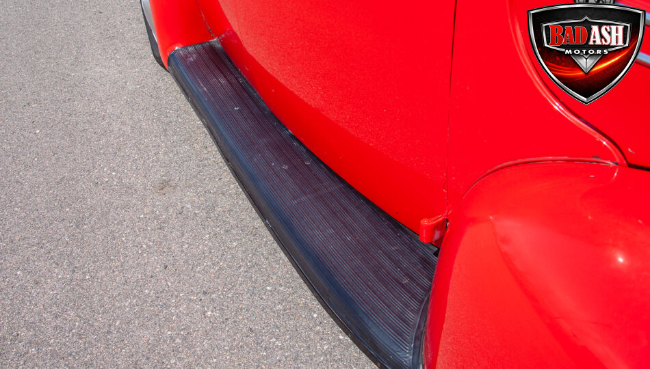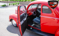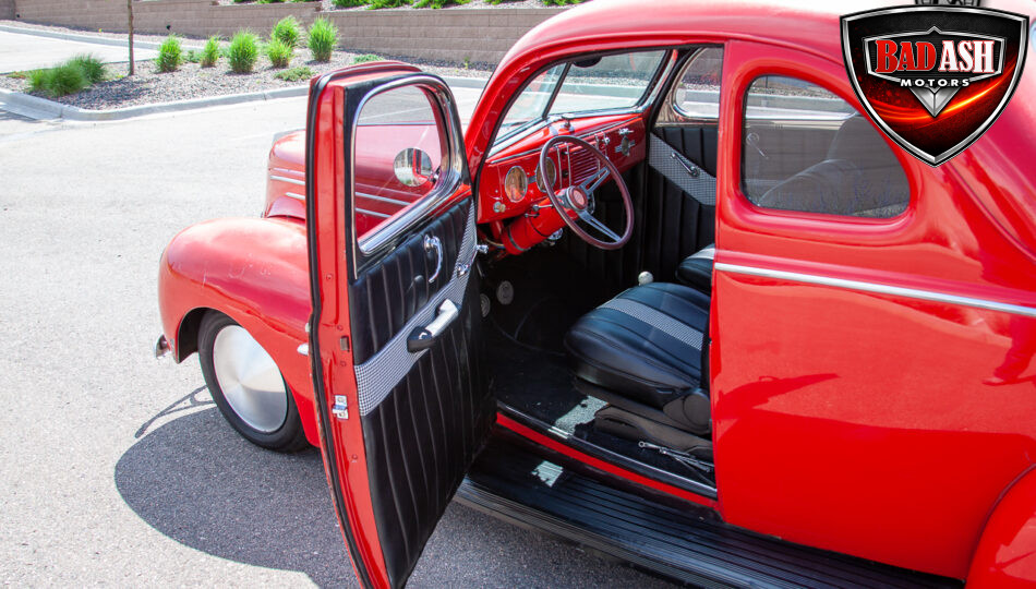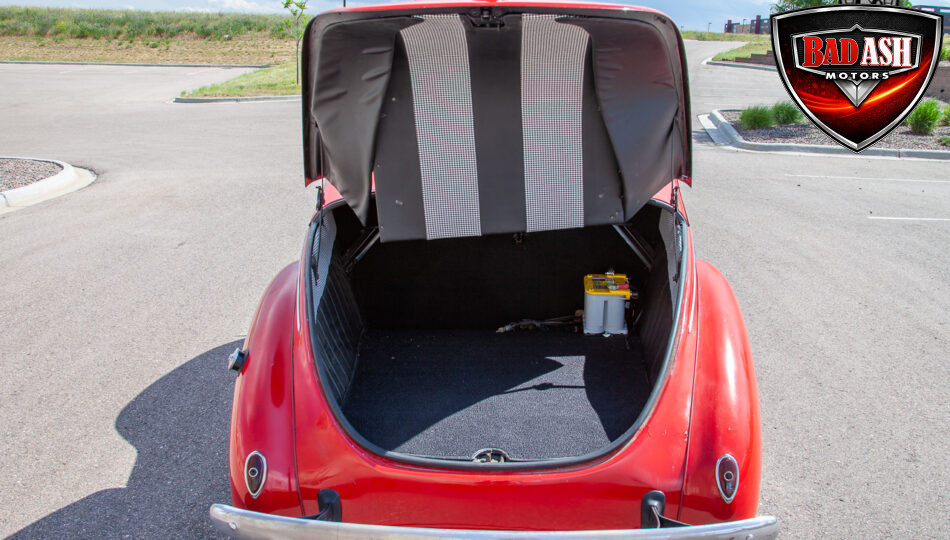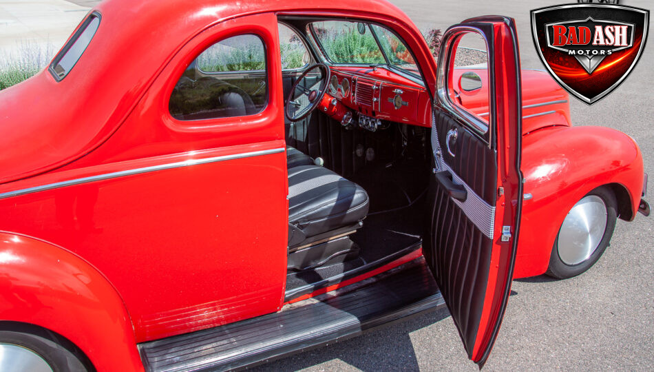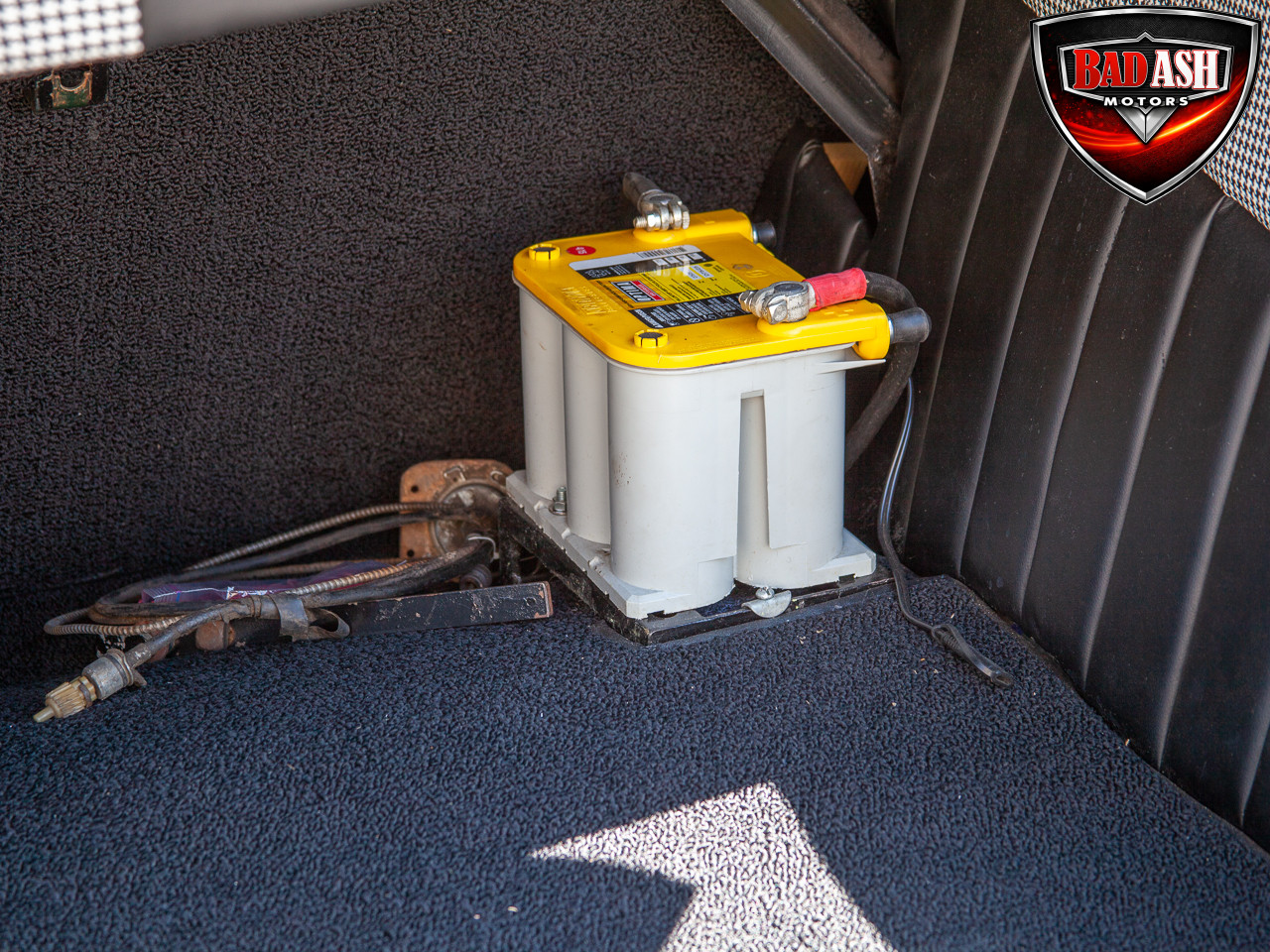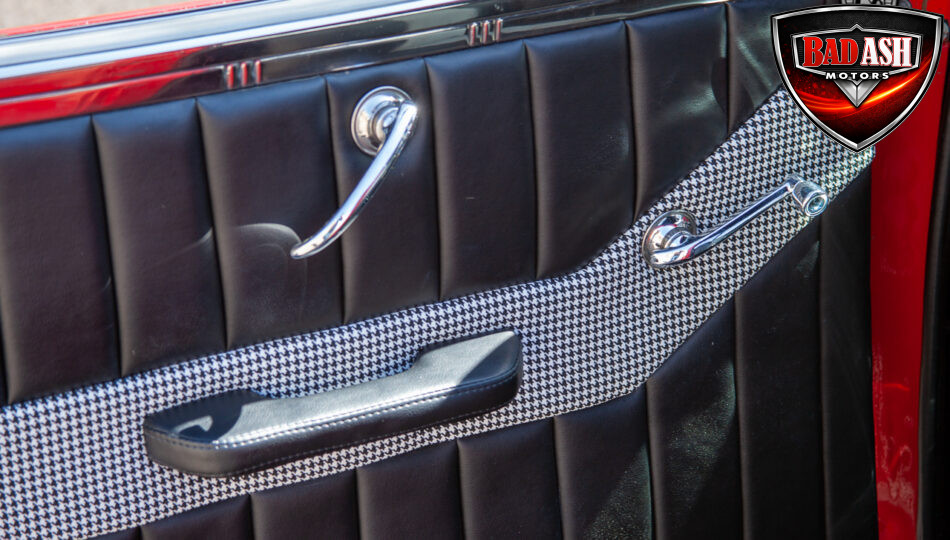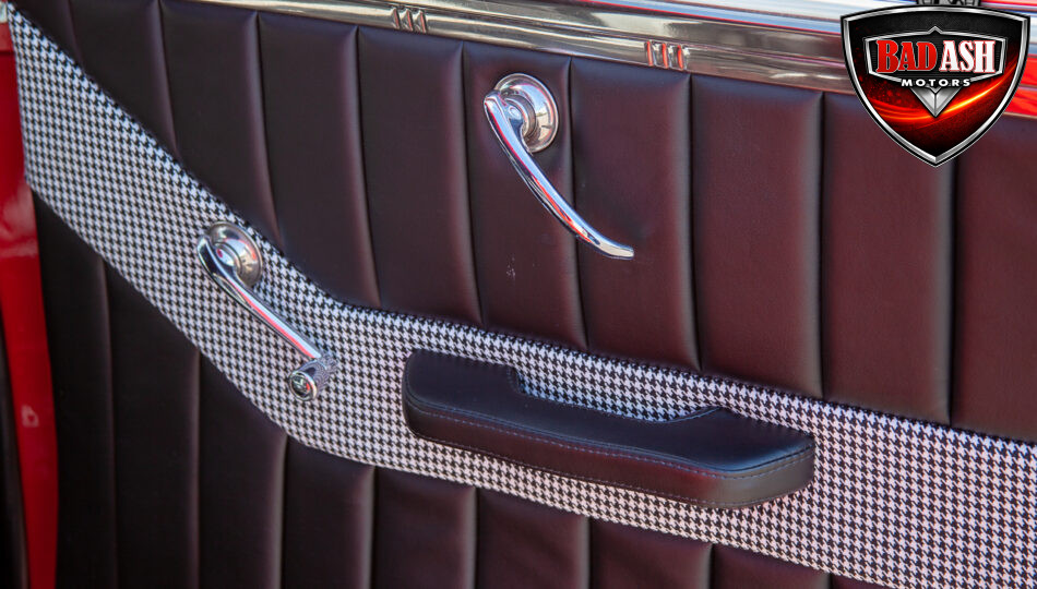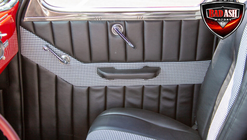 This red coupe is well equipped with a power driver’s seat and tilt steering wheel, while the custom interior features black cloth and leather seats with a houndstooth stripe for a classic performance look. Up front, it benefits from a Weed Eater crossmember, tubular A-arms, and Mustang II–style disc brakes.