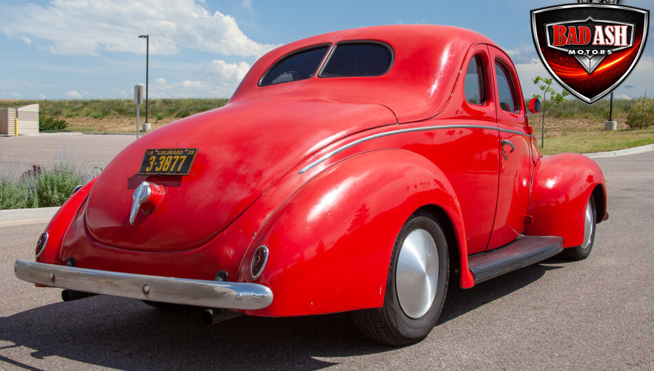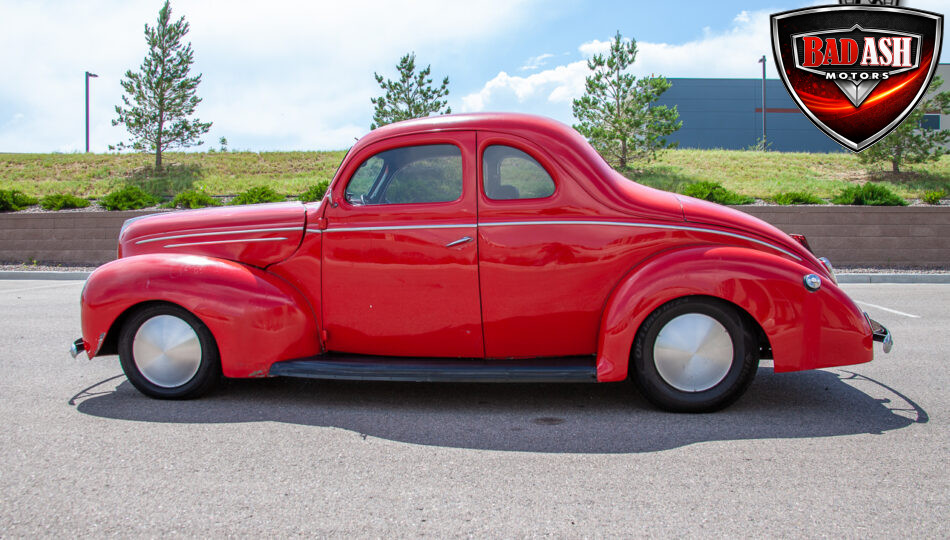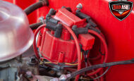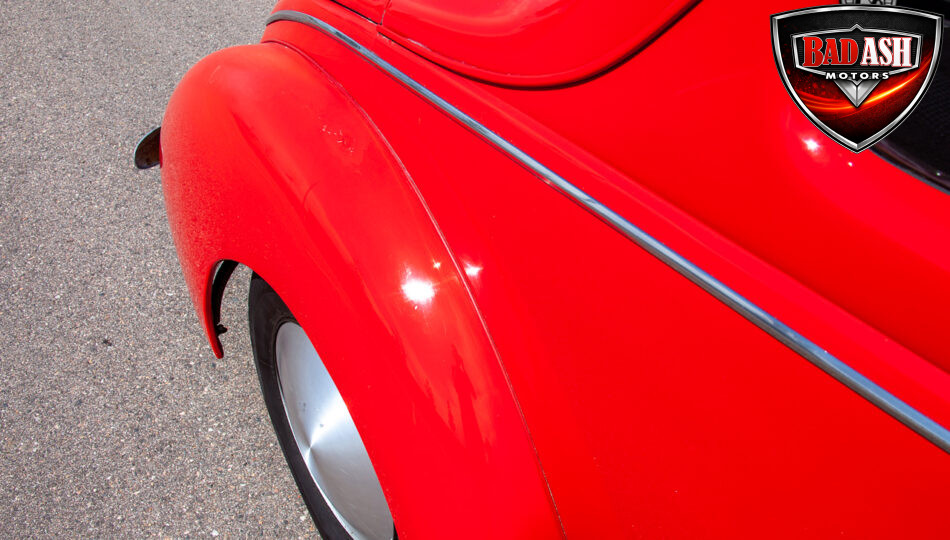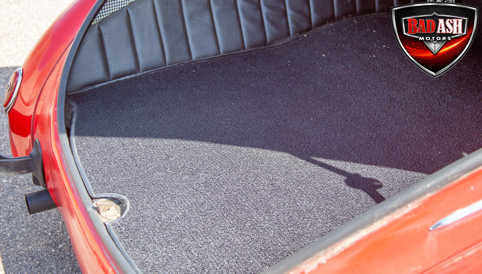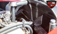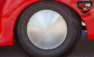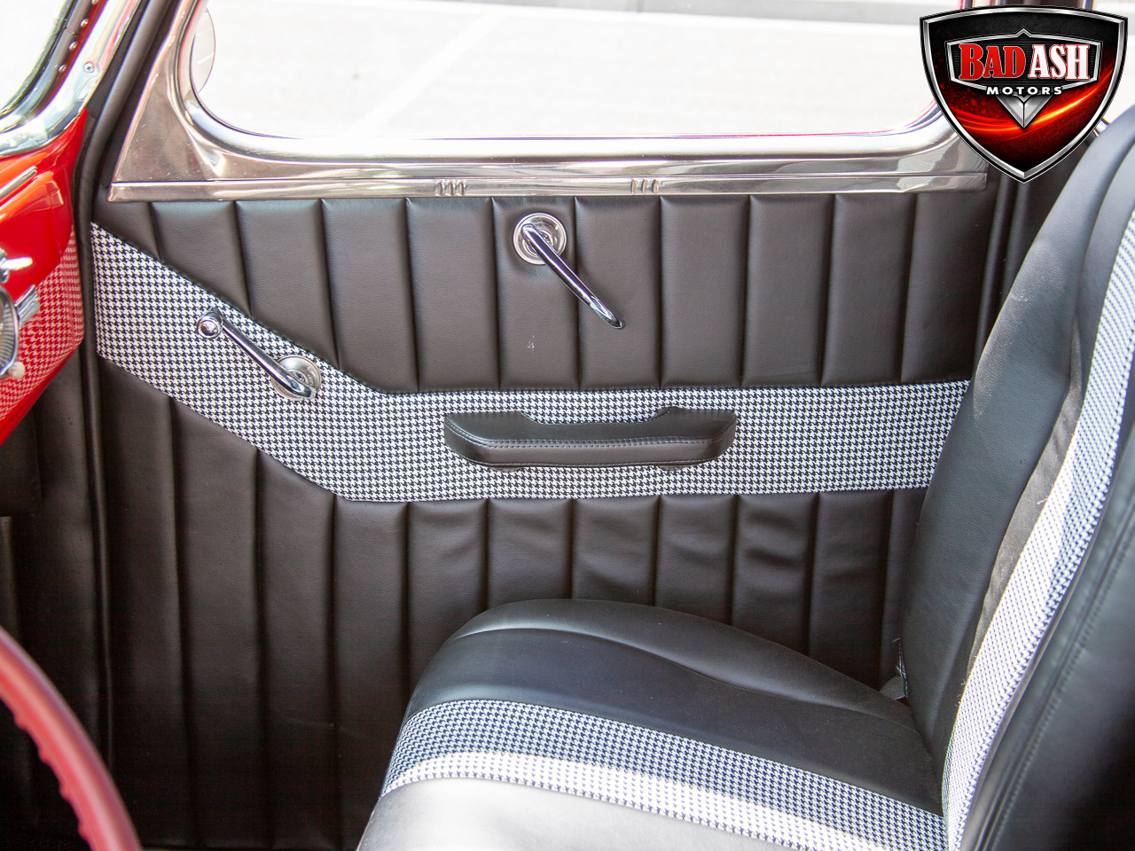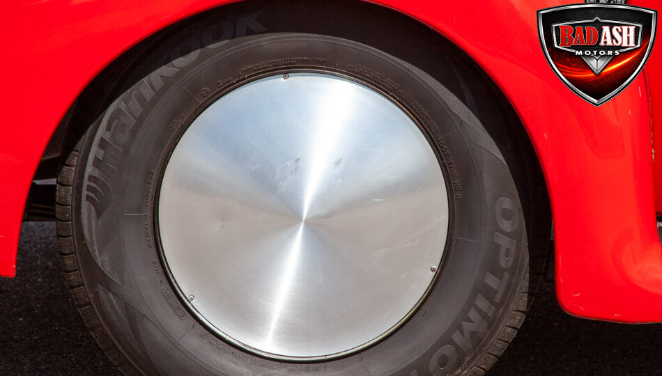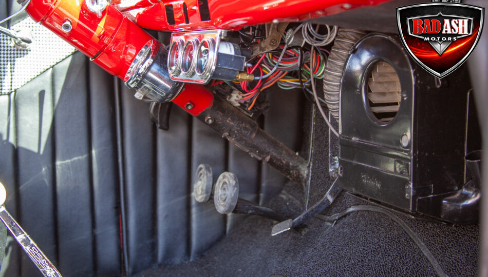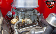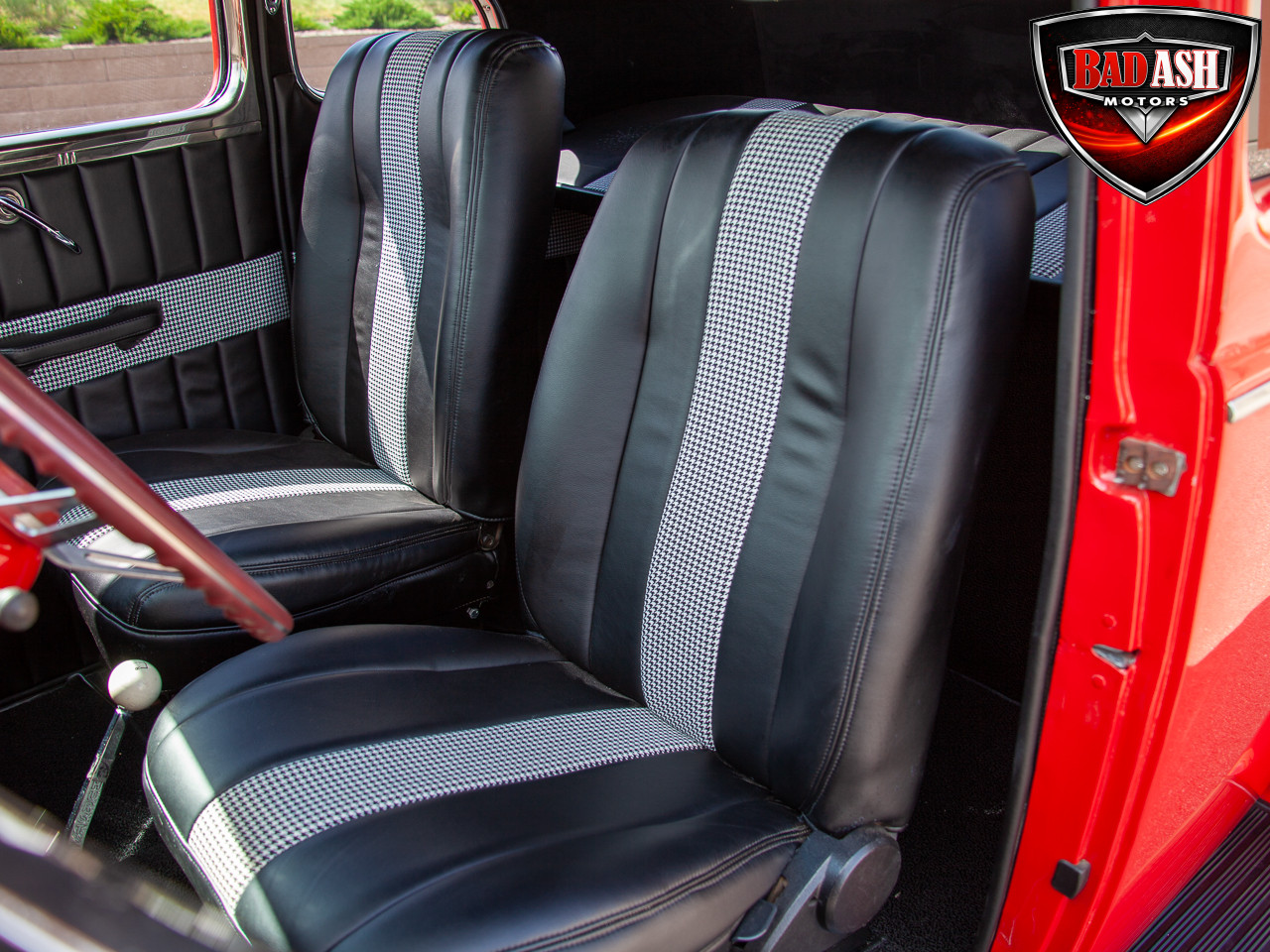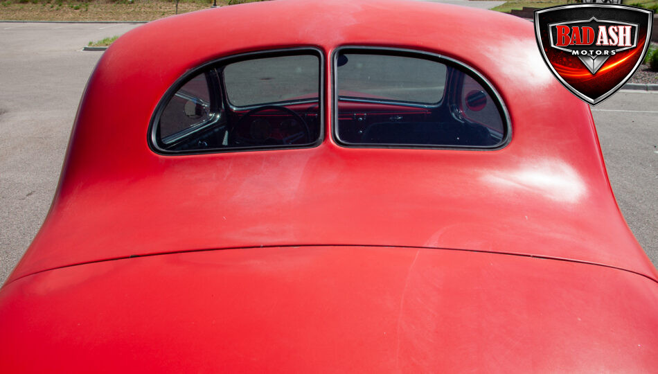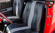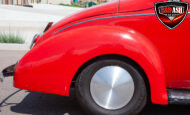 This red coupe is well equipped with a power driver’s seat and tilt steering wheel, while the custom interior features black cloth and leather seats with a houndstooth stripe for a classic performance look. Up front, it benefits from a Weed Eater crossmember, tubular A-arms, and Mustang II–style disc brakes.