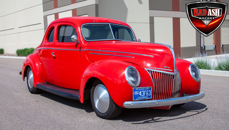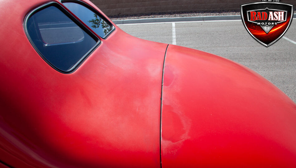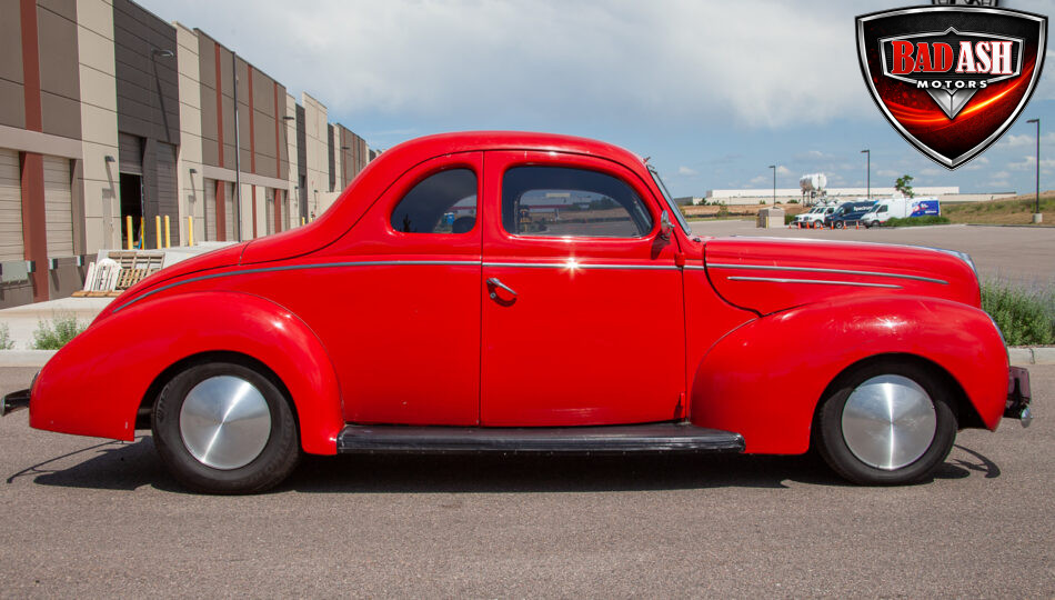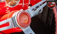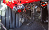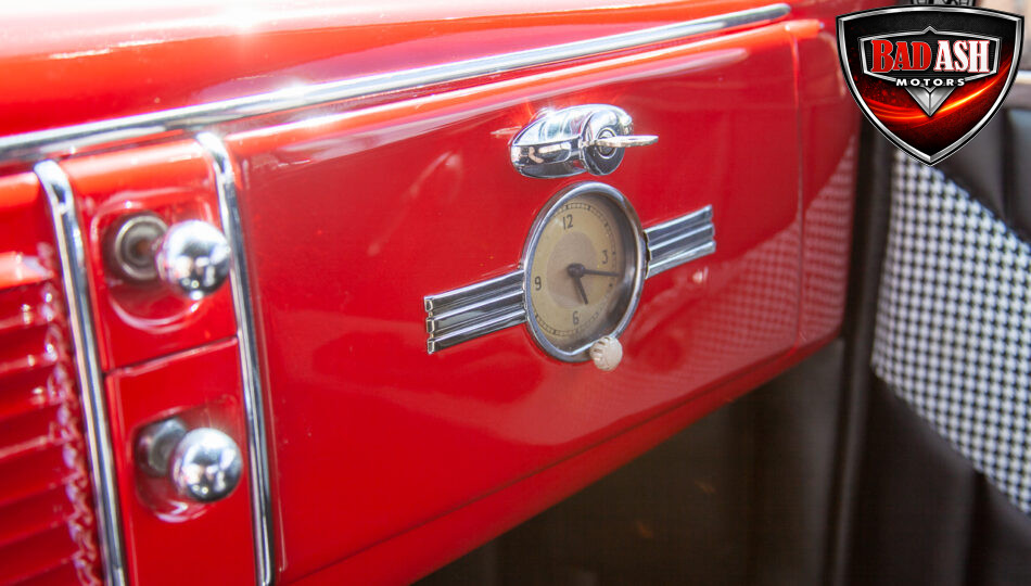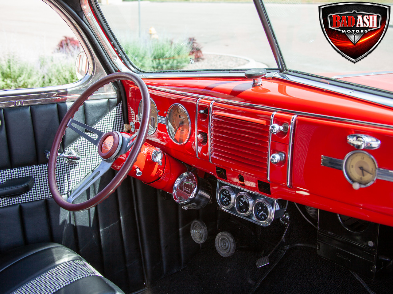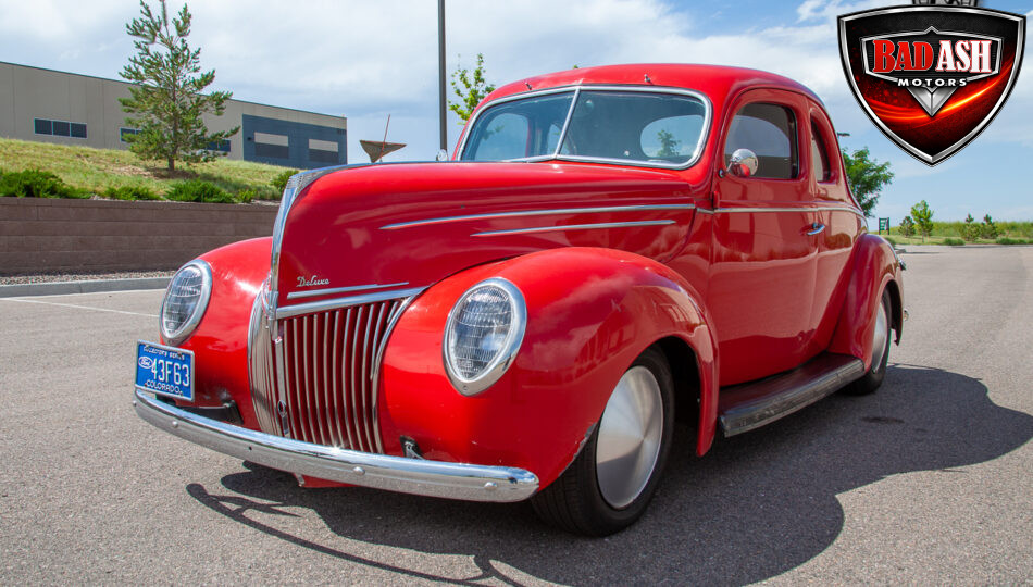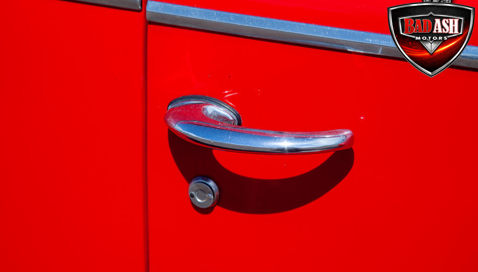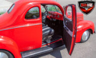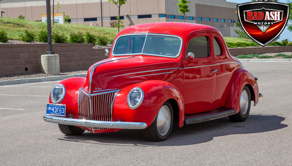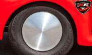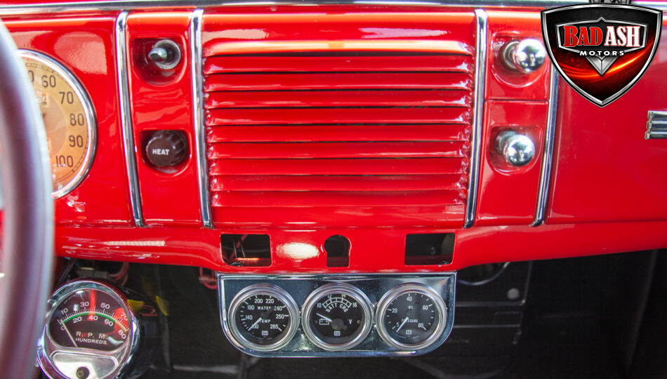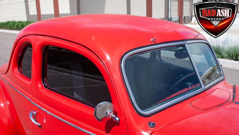This red coupe is well equipped with a power driver’s seat and tilt steering wheel, while the custom interior features black cloth and leather seats with a houndstooth stripe for a classic performance look. Up front, it benefits from a Weed Eater crossmember, tubular A-arms, and Mustang II–style disc brakes.