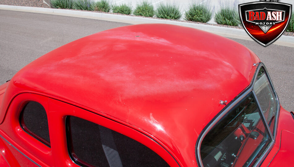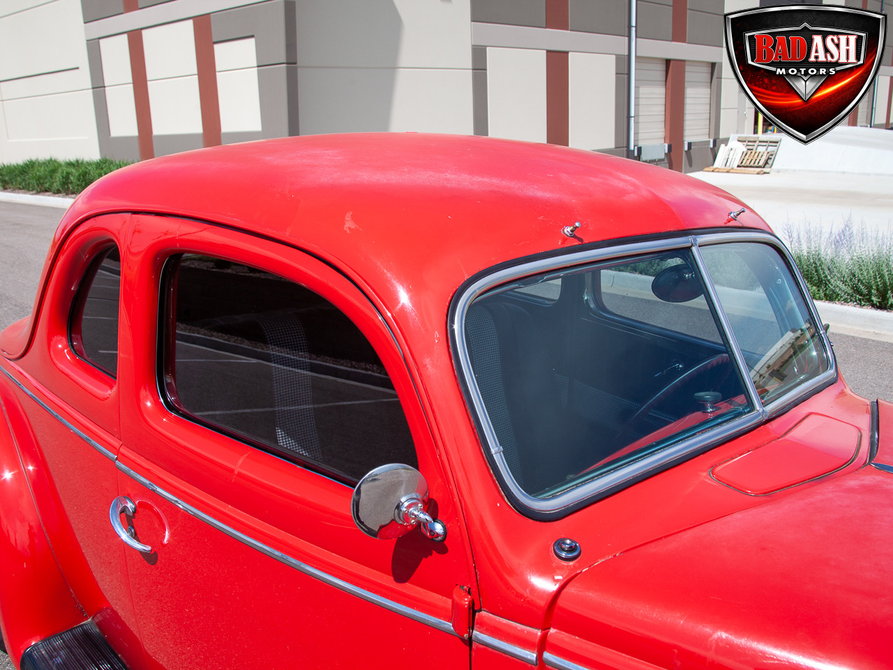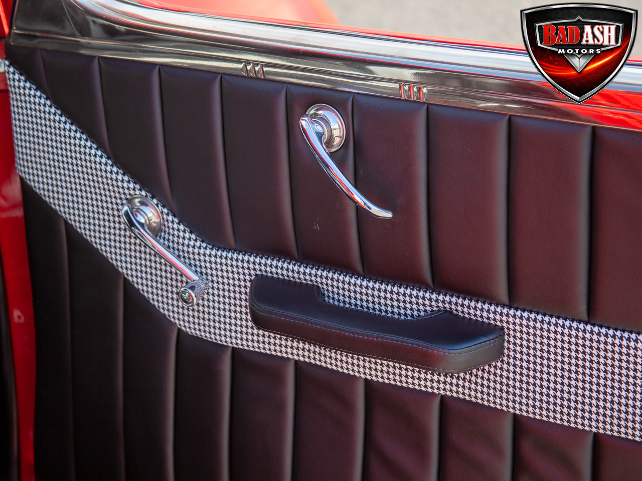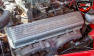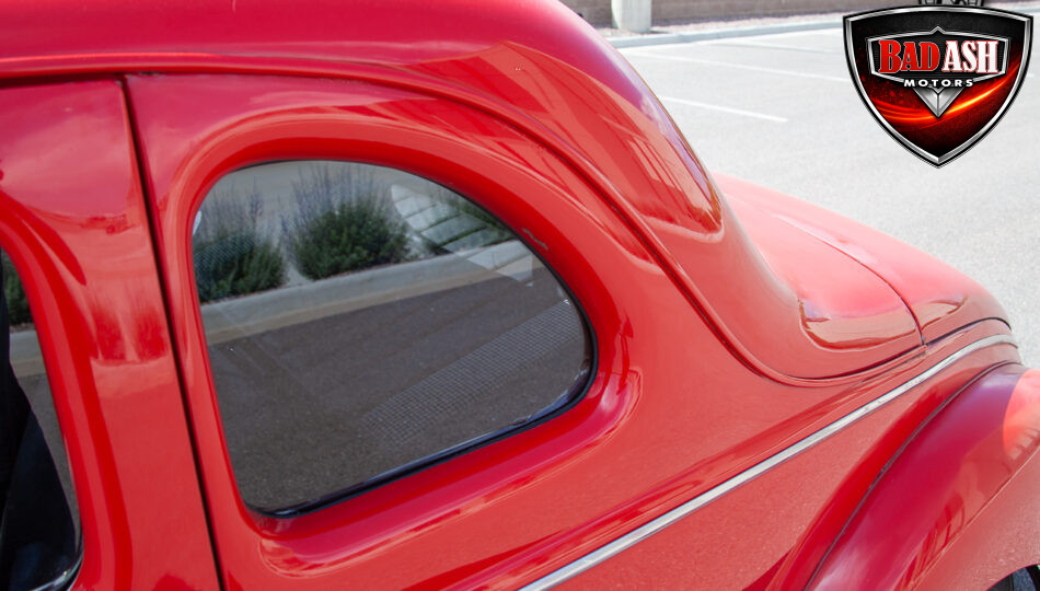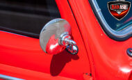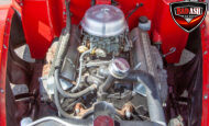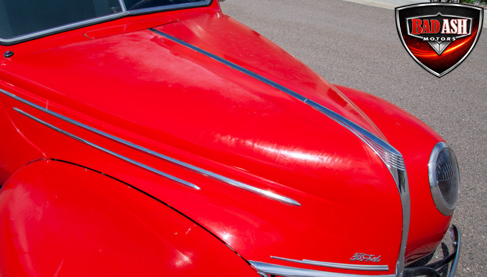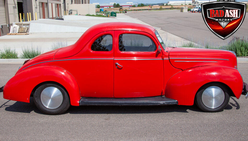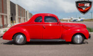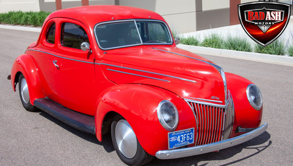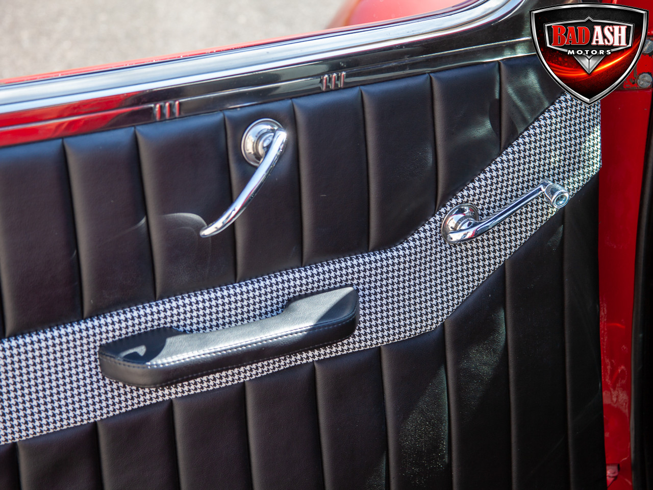 This red coupe is well equipped with a power driver’s seat and tilt steering wheel, while the custom interior features black cloth and leather seats with a houndstooth stripe for a classic performance look. Up front, it benefits from a Weed Eater crossmember, tubular A-arms, and Mustang II–style disc brakes.