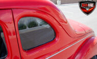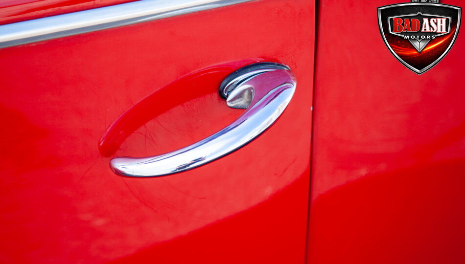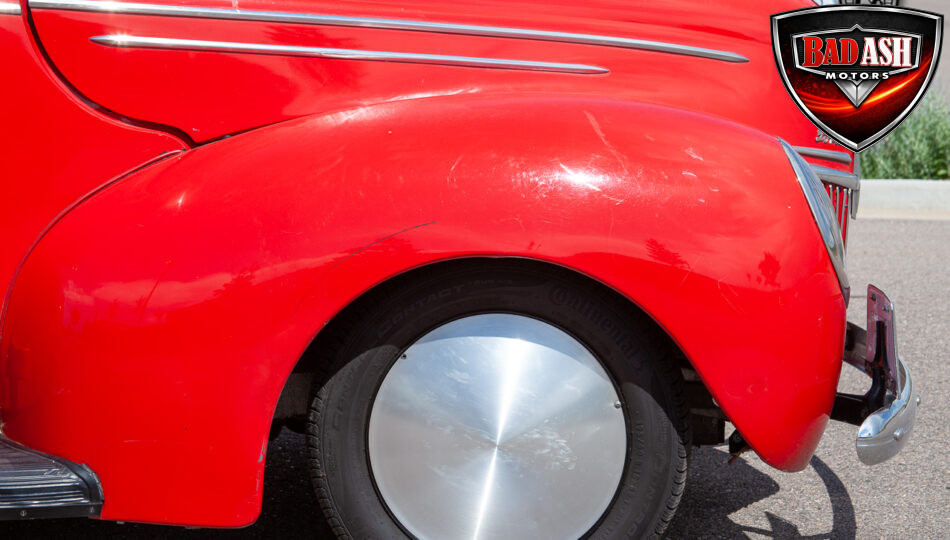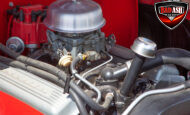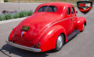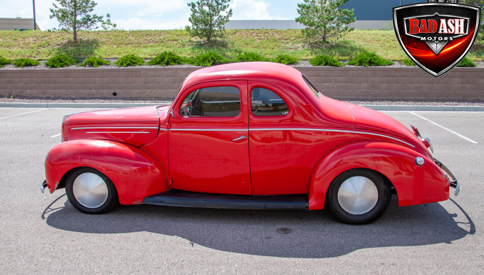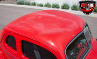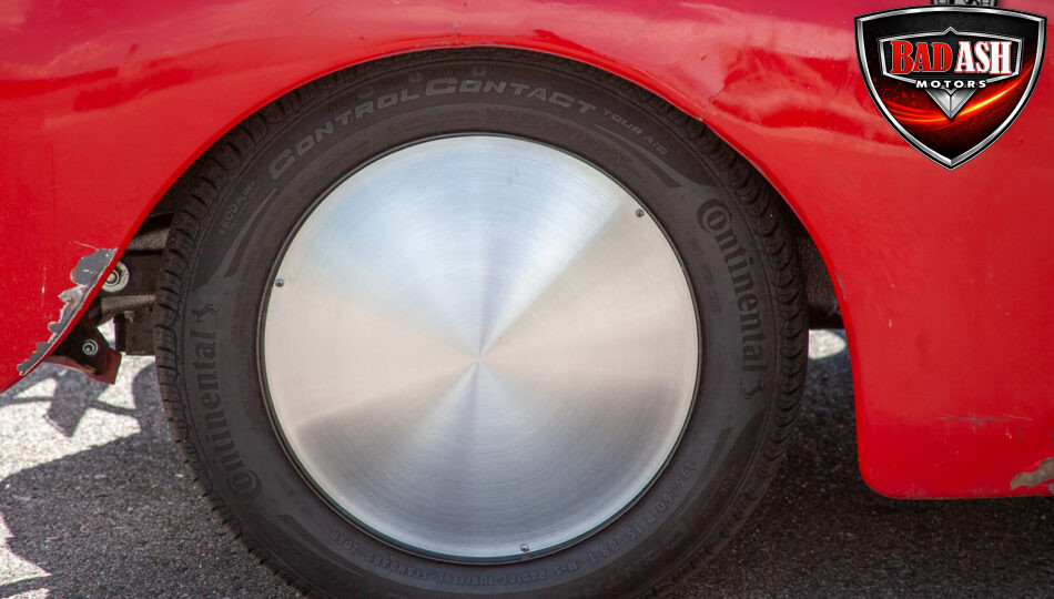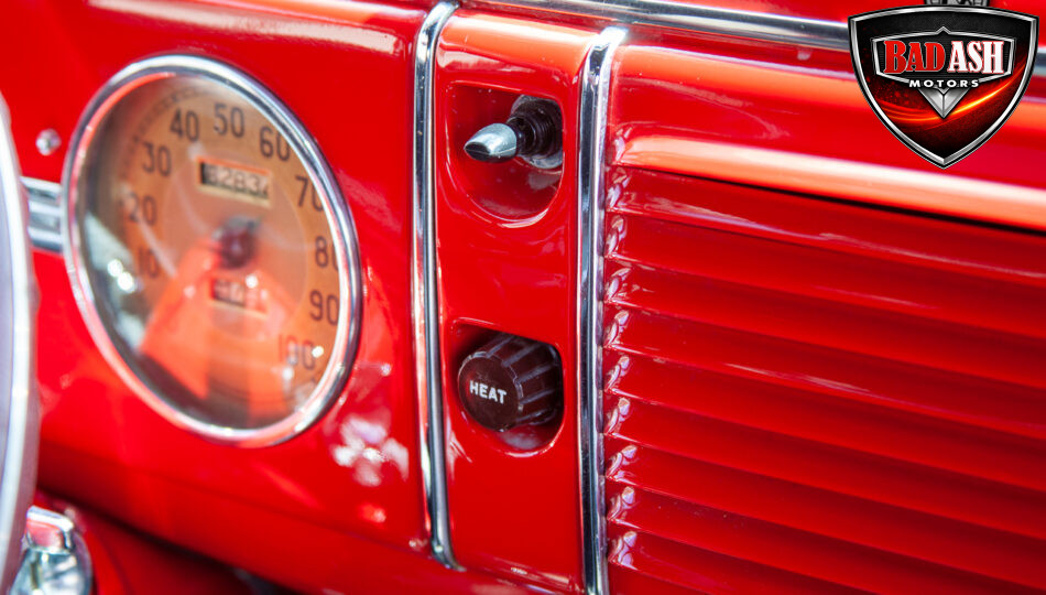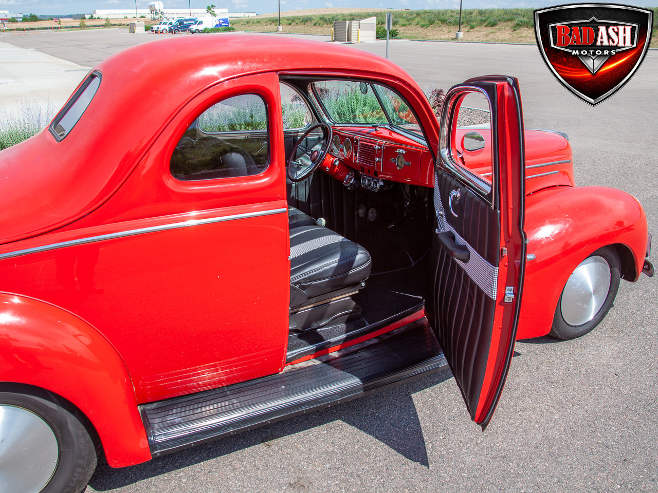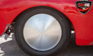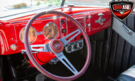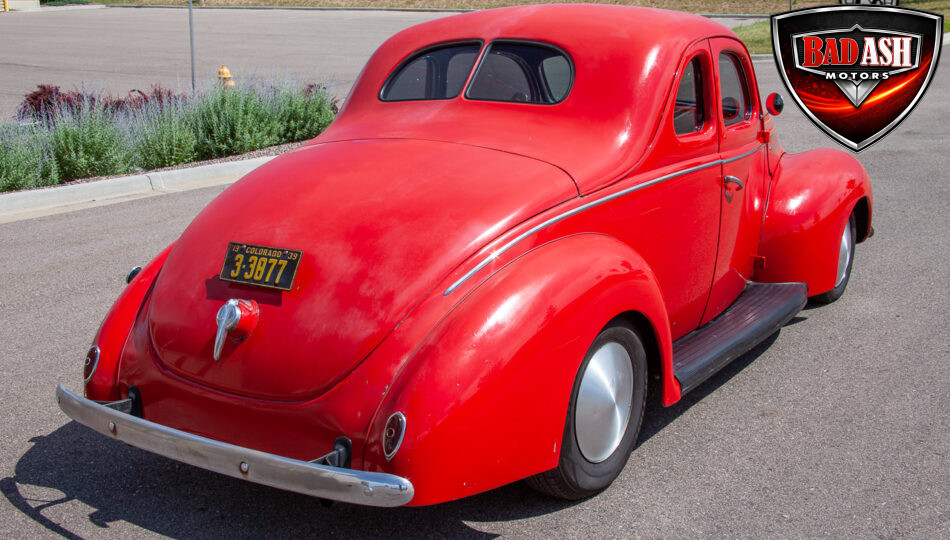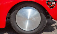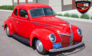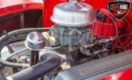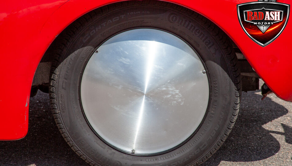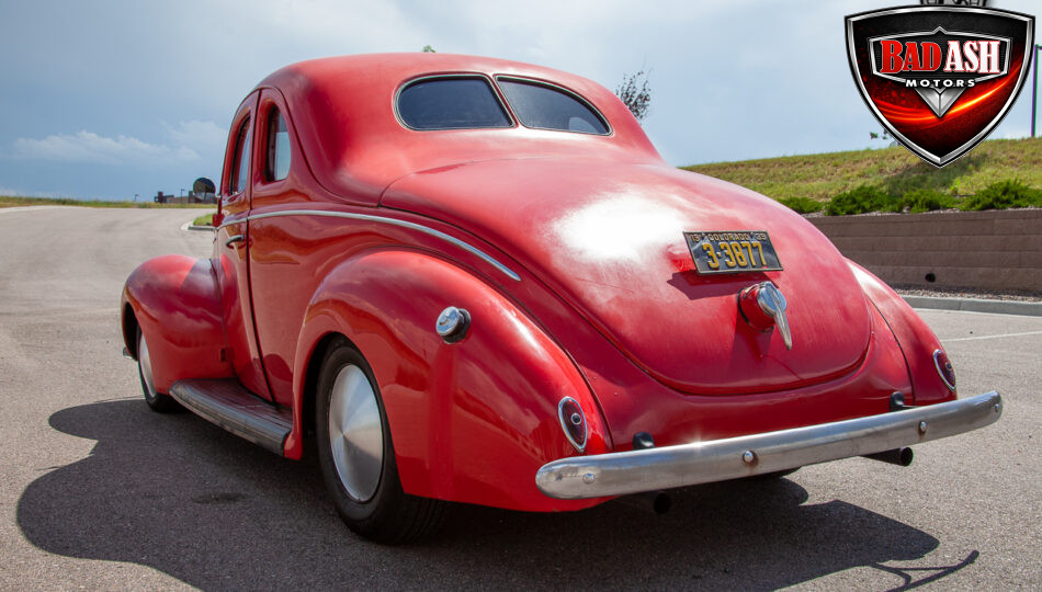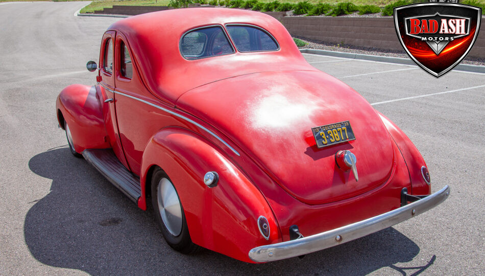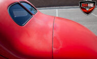 This red coupe is well equipped with a power driver’s seat and tilt steering wheel, while the custom interior features black cloth and leather seats with a houndstooth stripe for a classic performance look. Up front, it benefits from a Weed Eater crossmember, tubular A-arms, and Mustang II–style disc brakes.