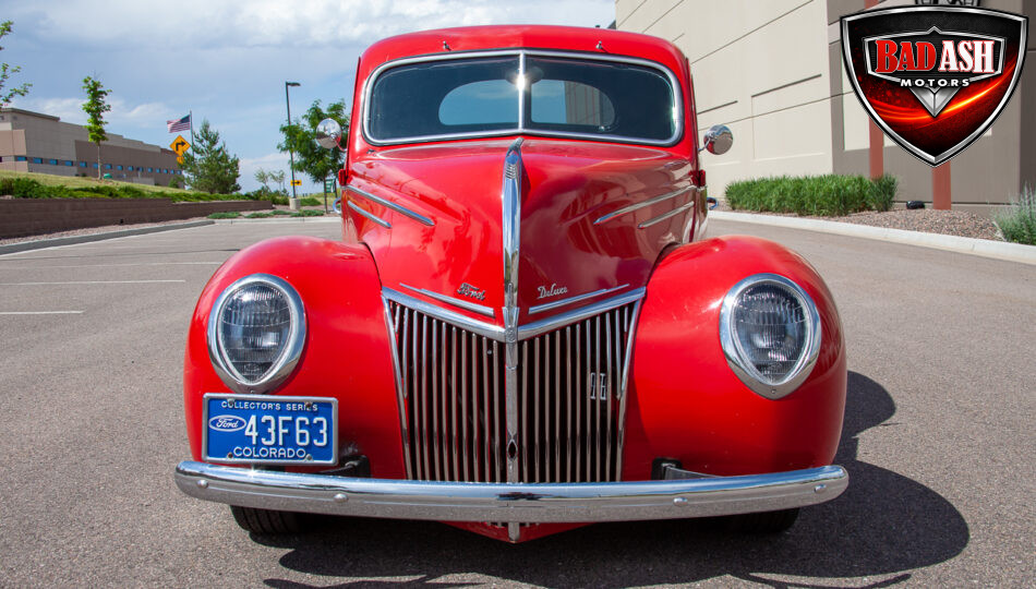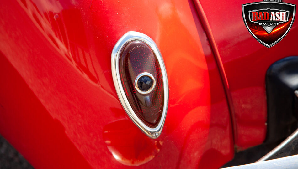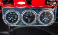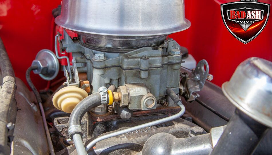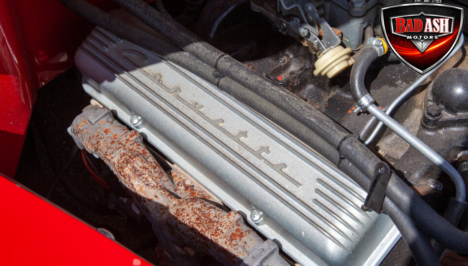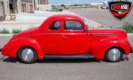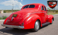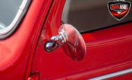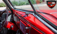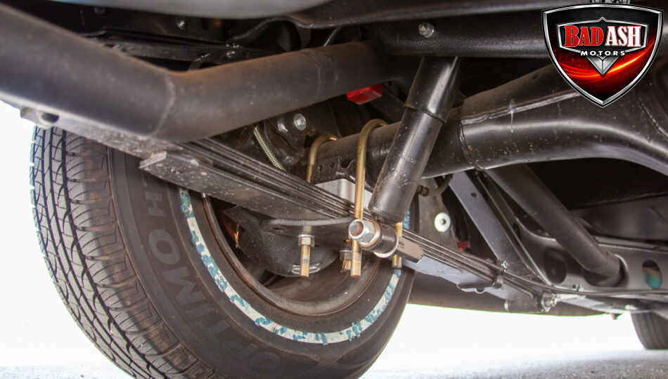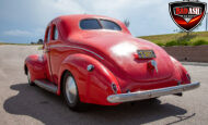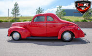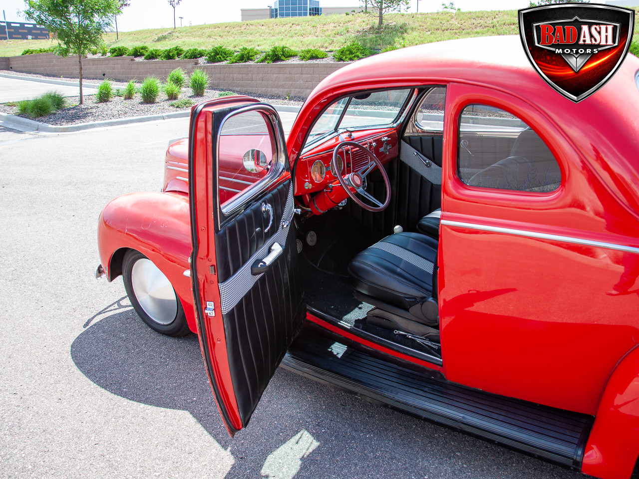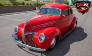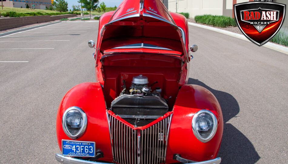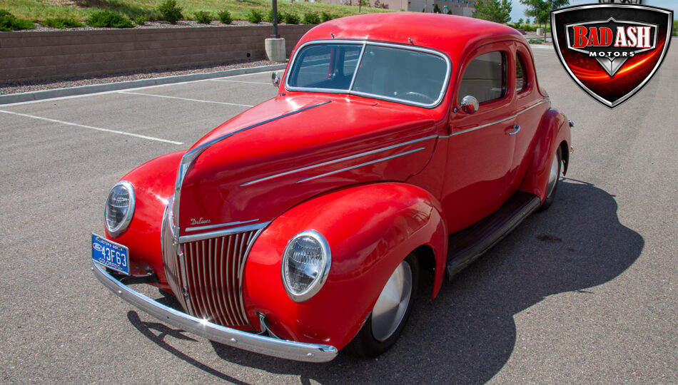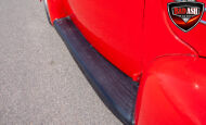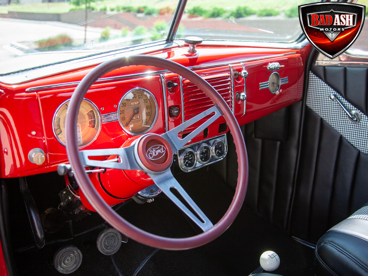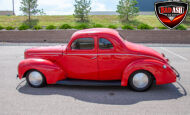 This red coupe is well equipped with a power driver’s seat and tilt steering wheel, while the custom interior features black cloth and leather seats with a houndstooth stripe for a classic performance look. Up front, it benefits from a Weed Eater crossmember, tubular A-arms, and Mustang II–style disc brakes.