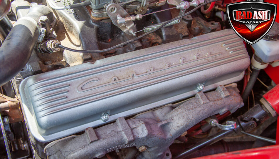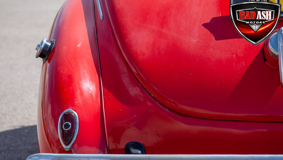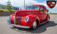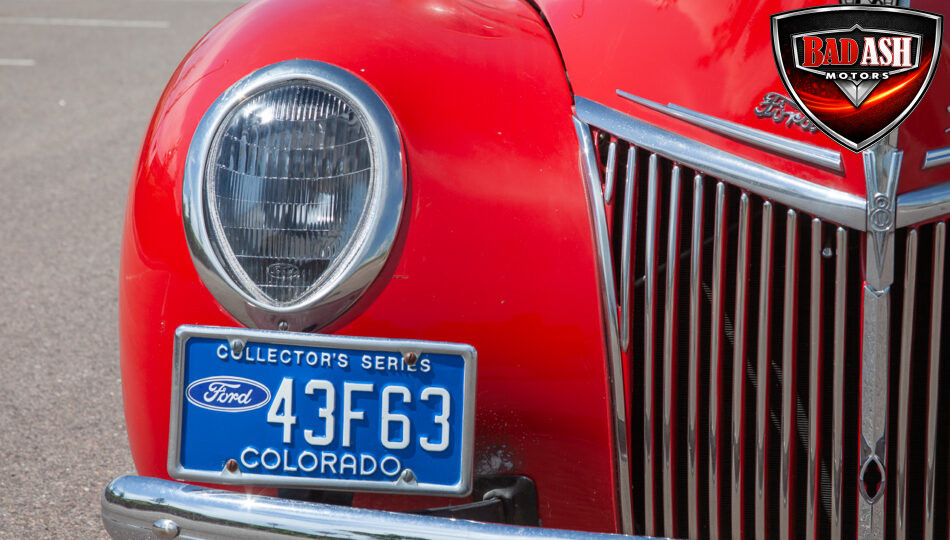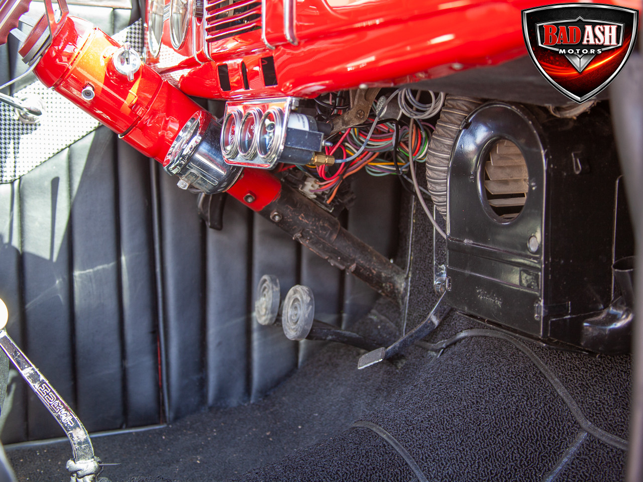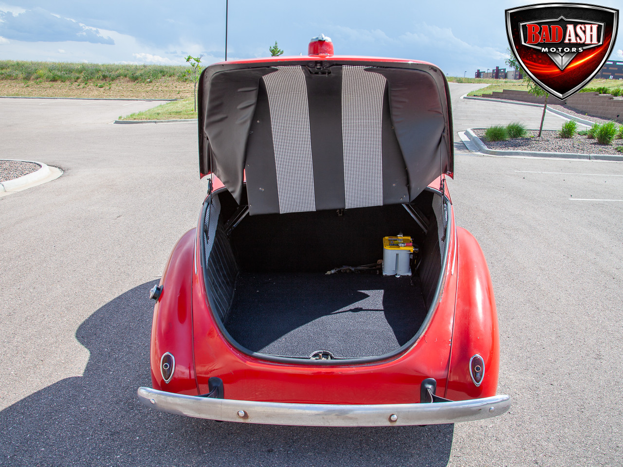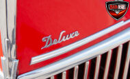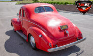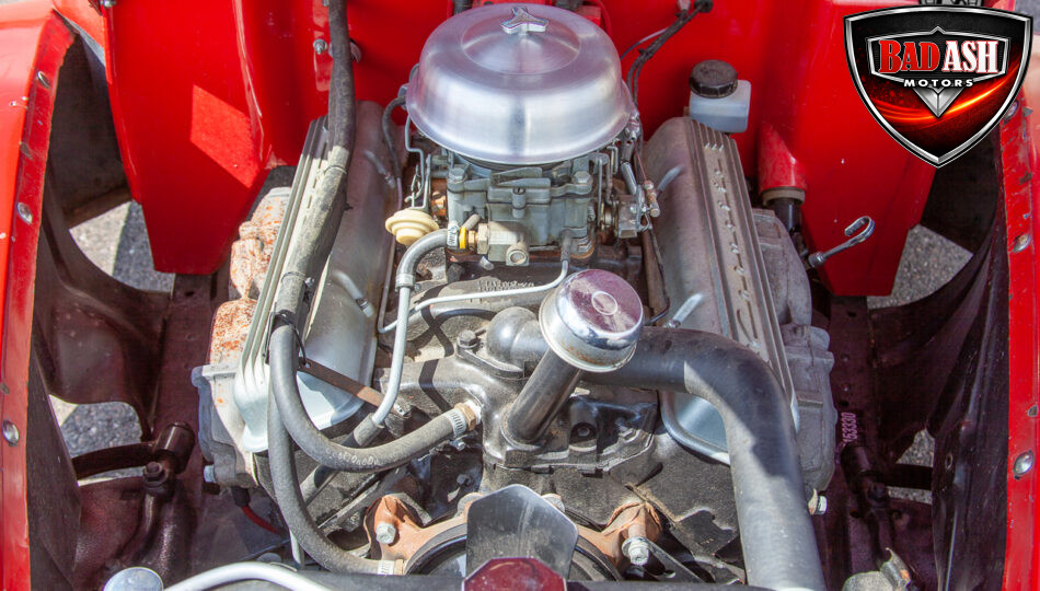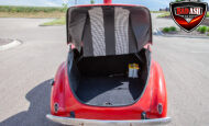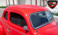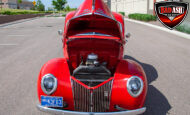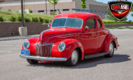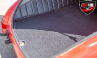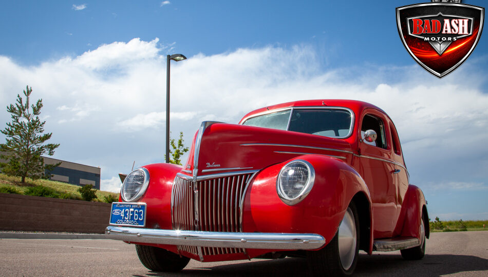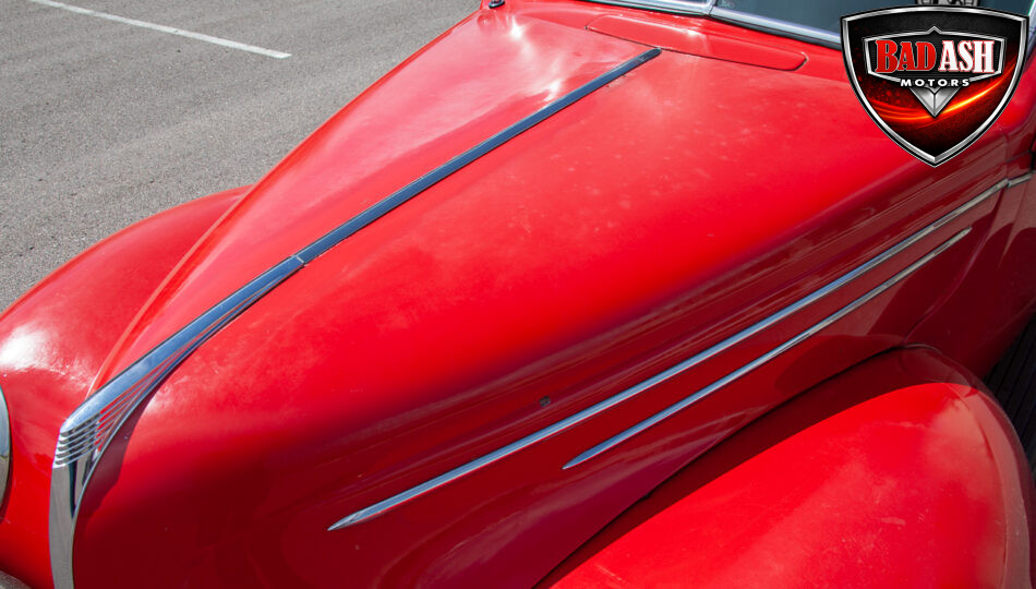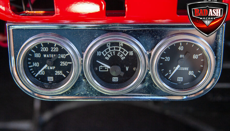 This red coupe is well equipped with a power driver’s seat and tilt steering wheel, while the custom interior features black cloth and leather seats with a houndstooth stripe for a classic performance look. Up front, it benefits from a Weed Eater crossmember, tubular A-arms, and Mustang II–style disc brakes.