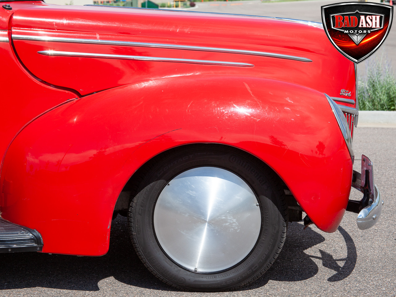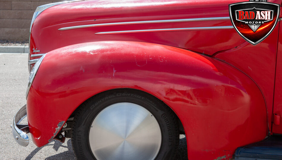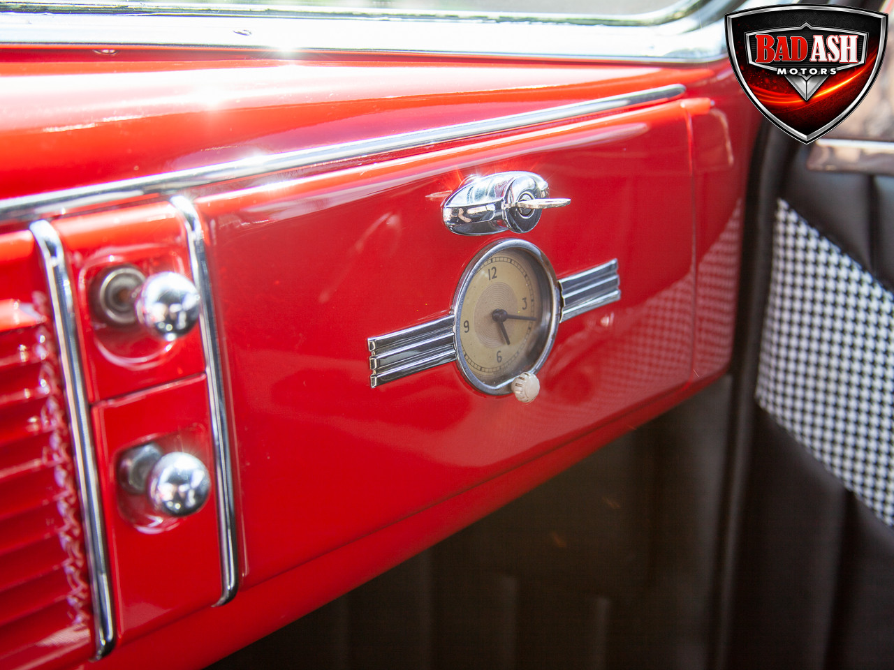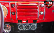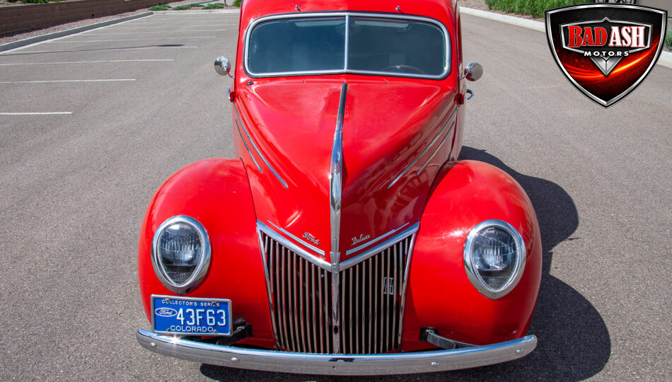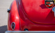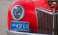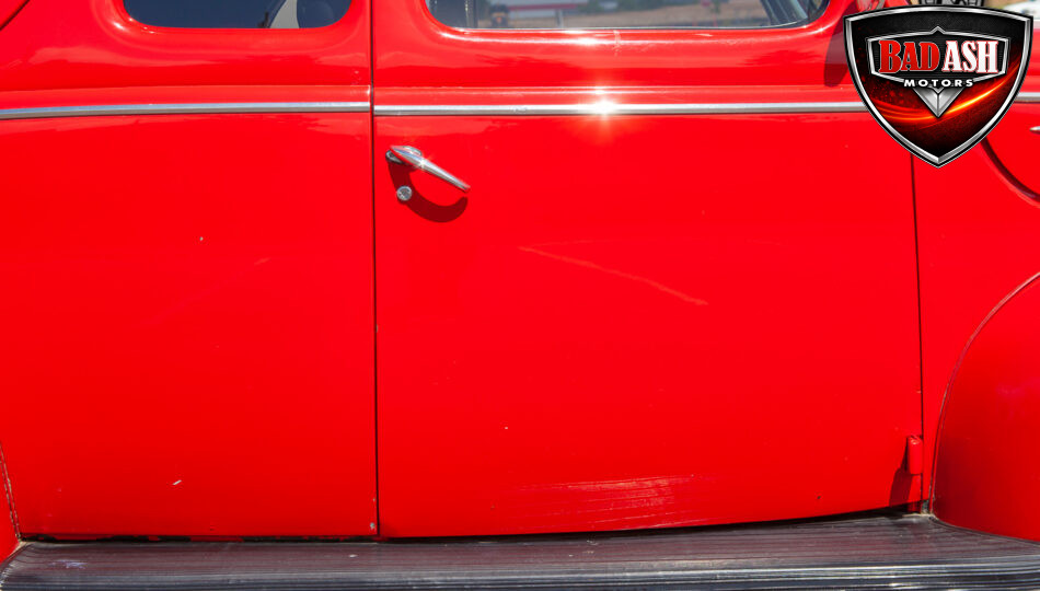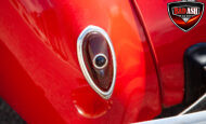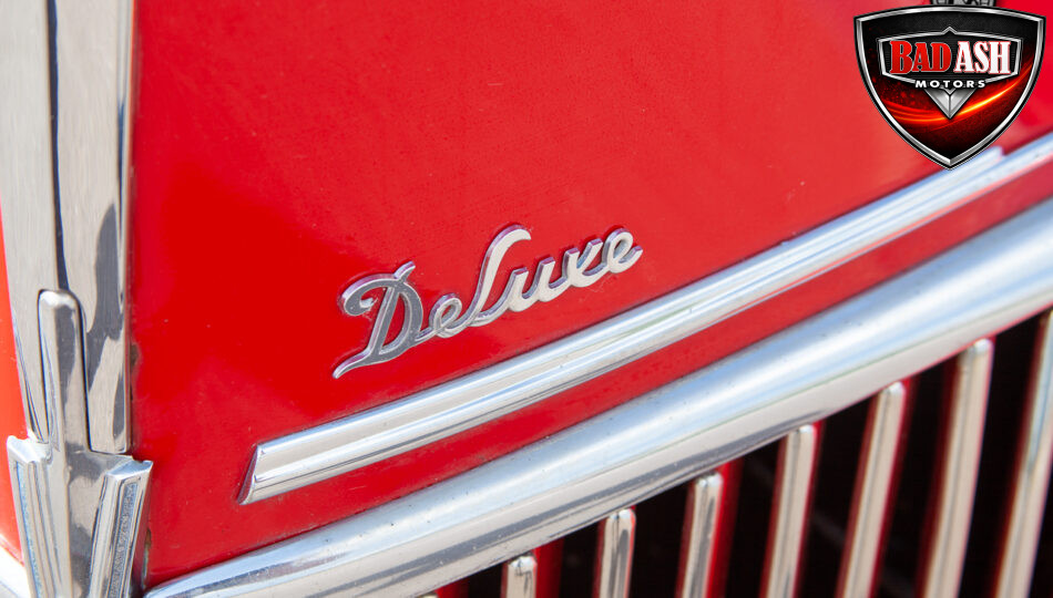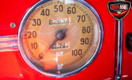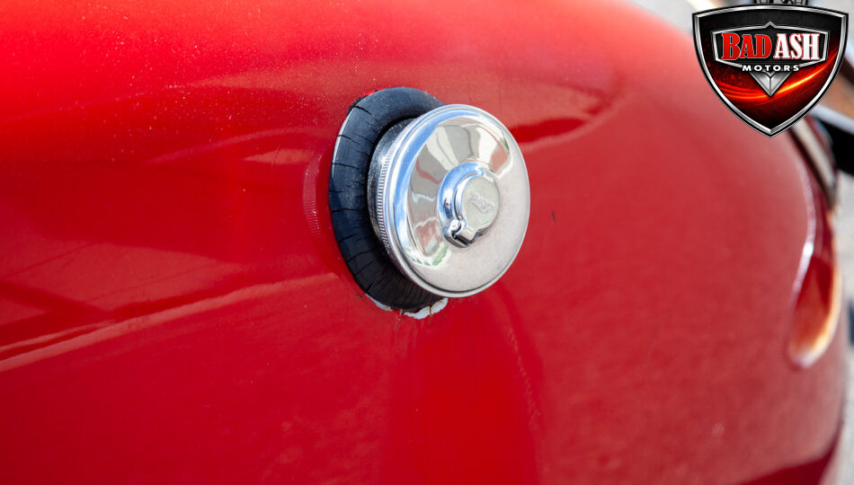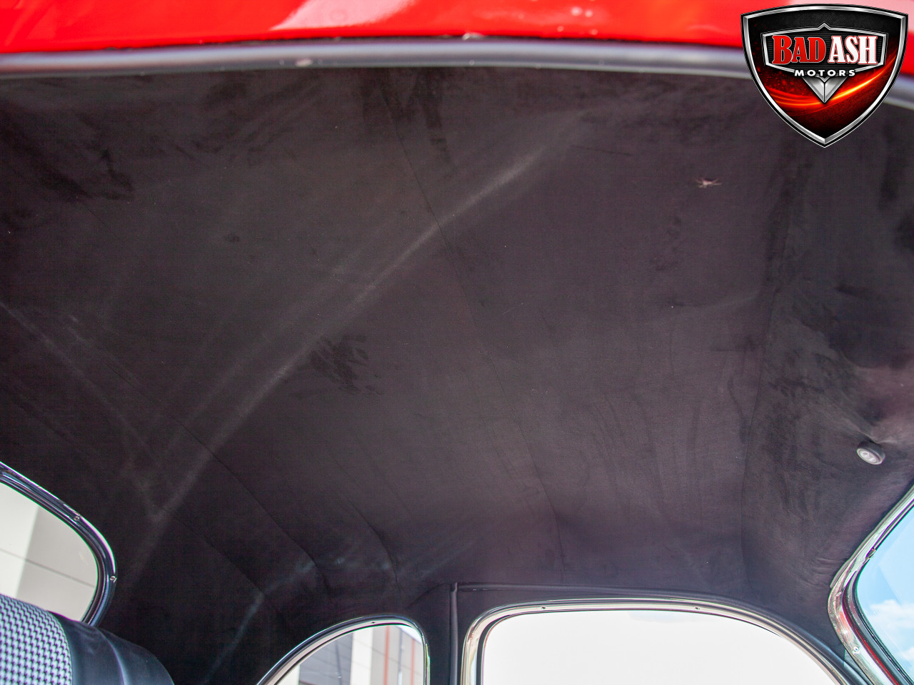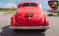 This red coupe is well equipped with a power driver’s seat and tilt steering wheel, while the custom interior features black cloth and leather seats with a houndstooth stripe for a classic performance look. Up front, it benefits from a Weed Eater crossmember, tubular A-arms, and Mustang II–style disc brakes.