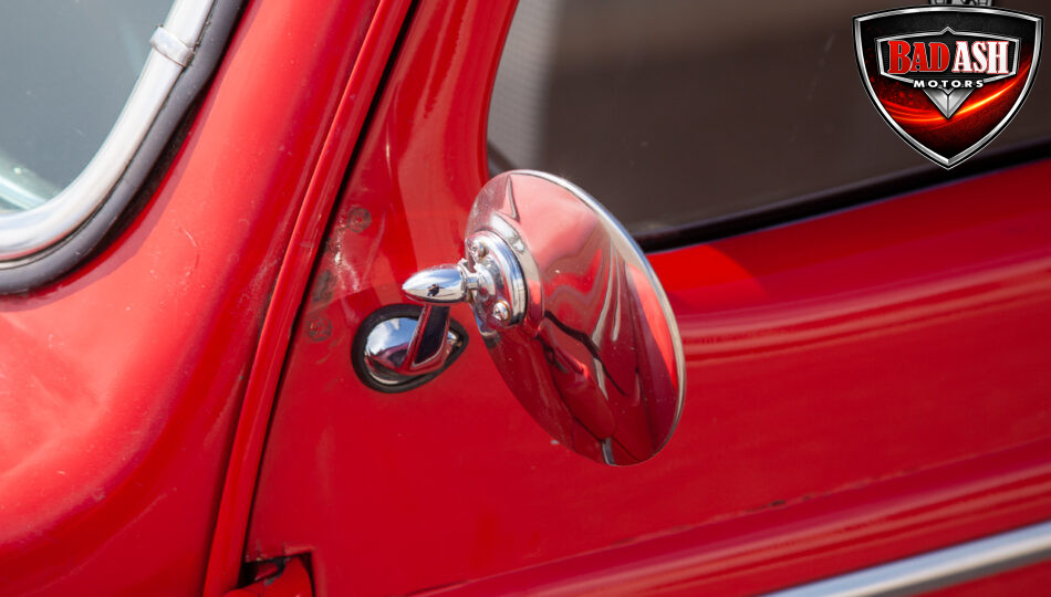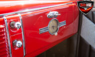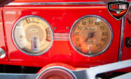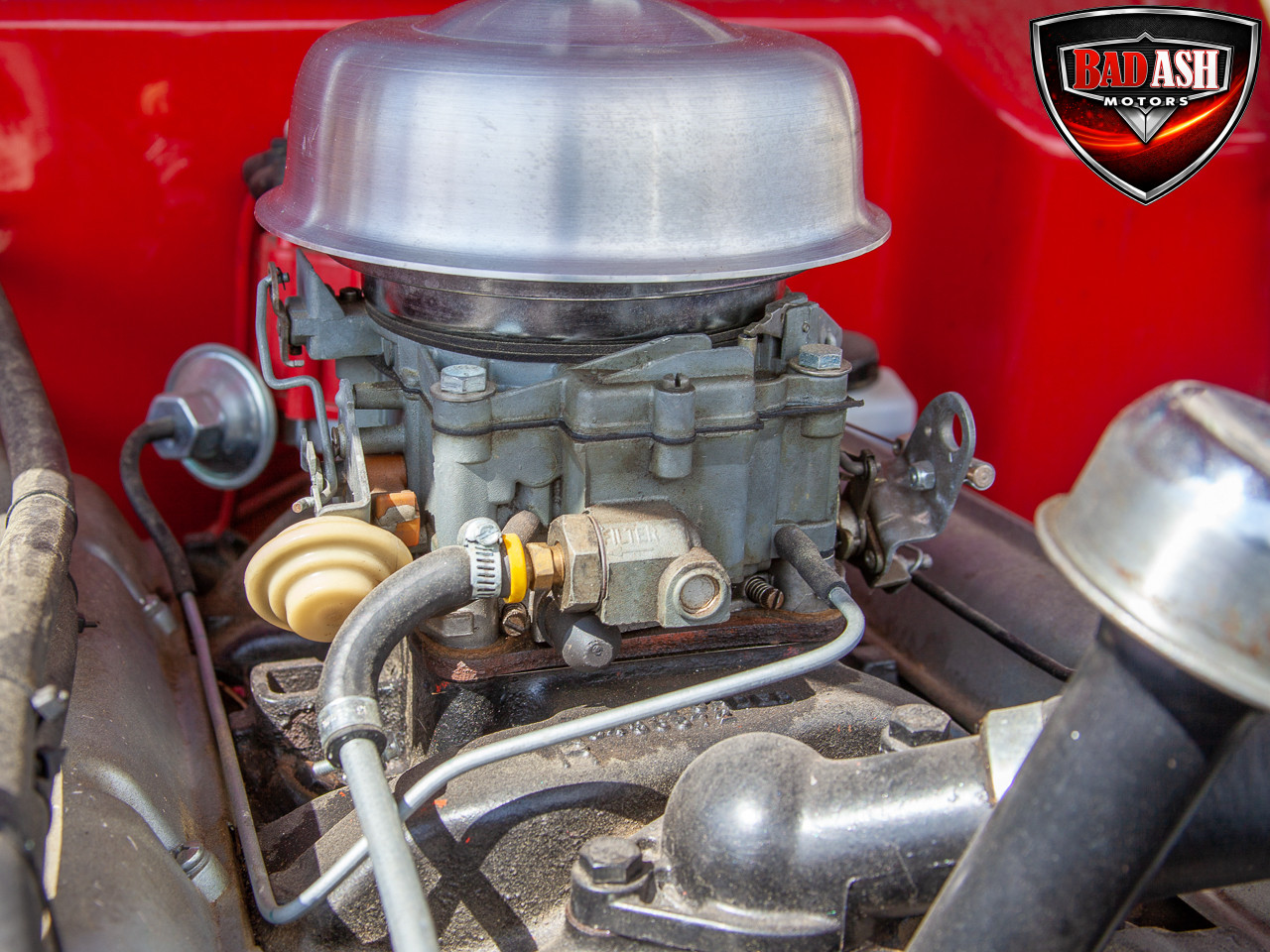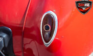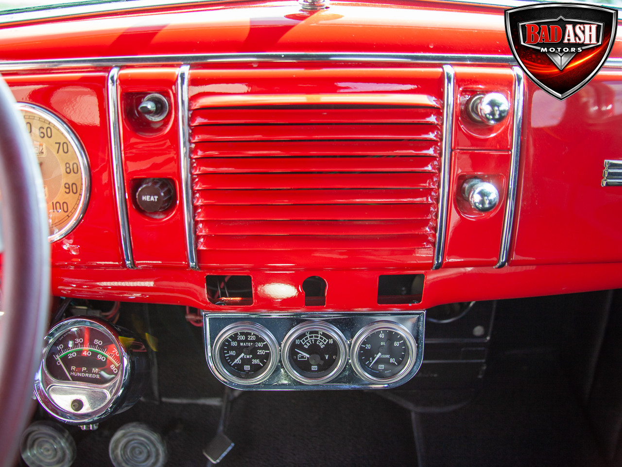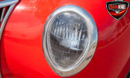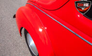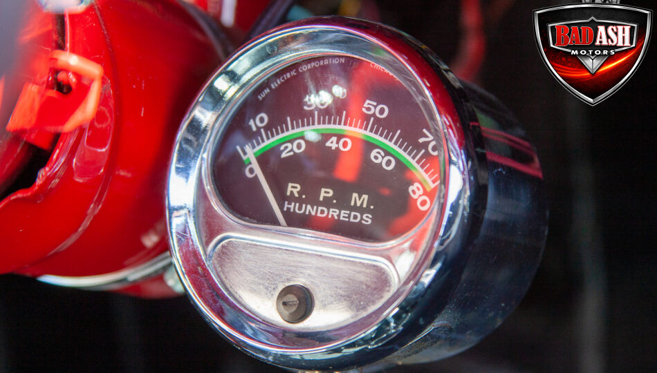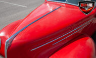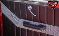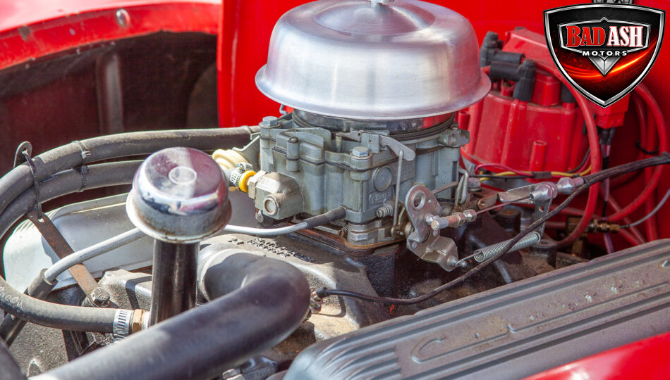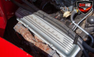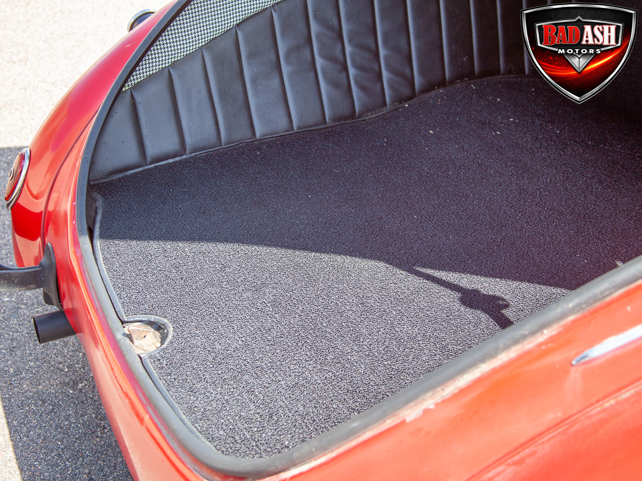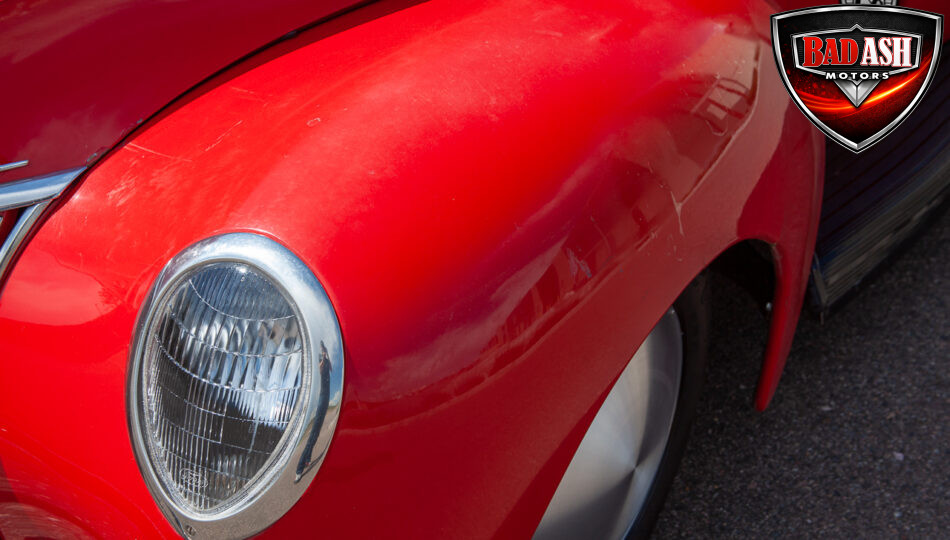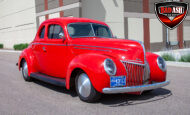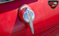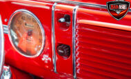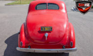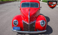 This red coupe is well equipped with a power driver’s seat and tilt steering wheel, while the custom interior features black cloth and leather seats with a houndstooth stripe for a classic performance look. Up front, it benefits from a Weed Eater crossmember, tubular A-arms, and Mustang II–style disc brakes.