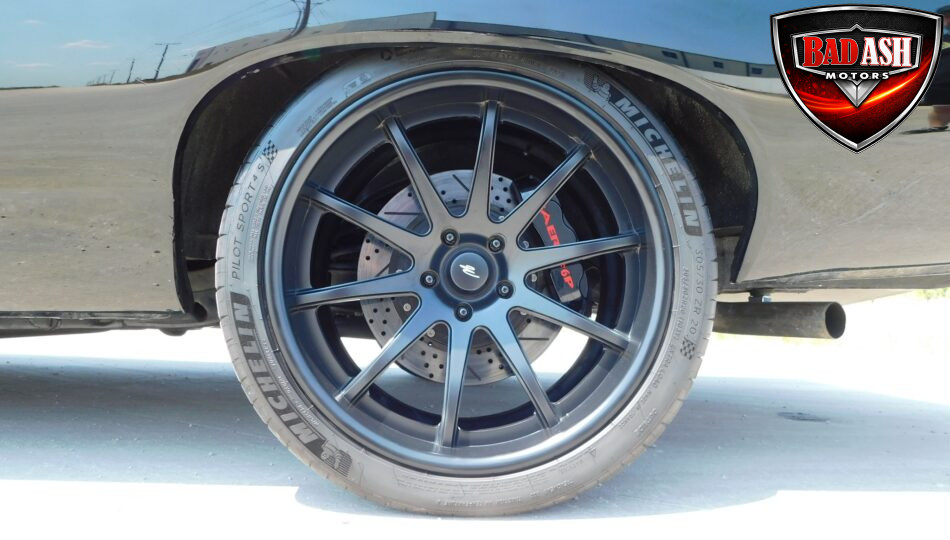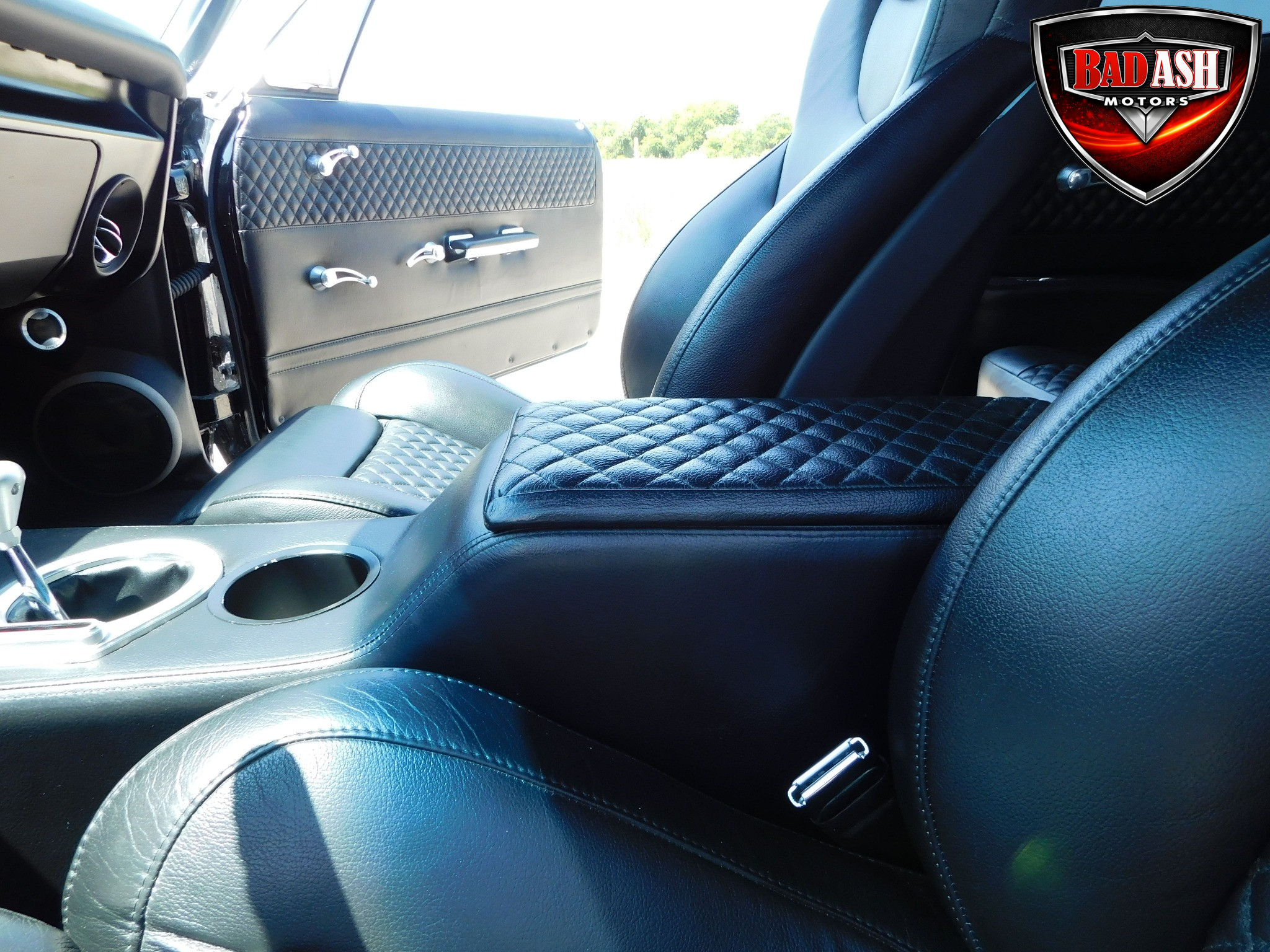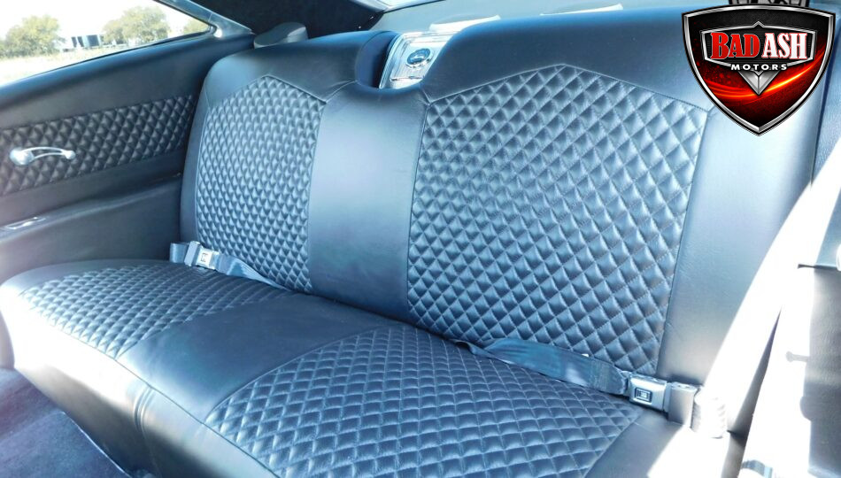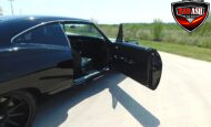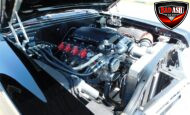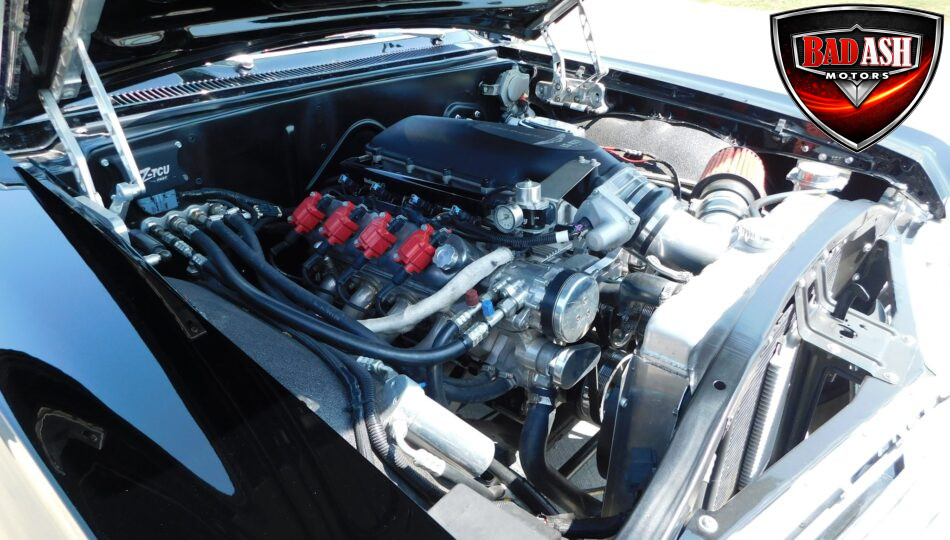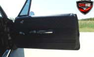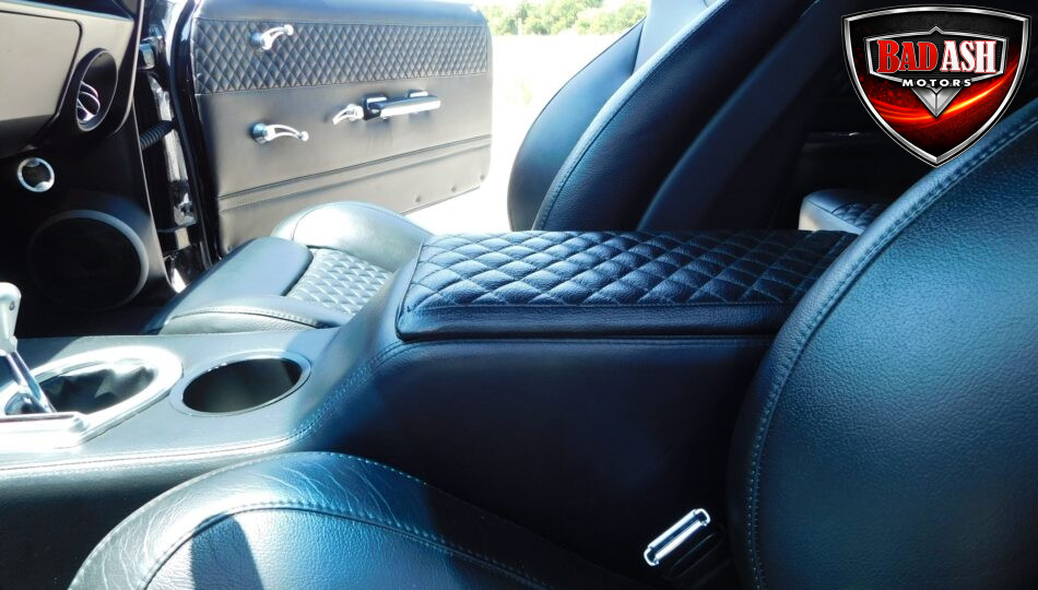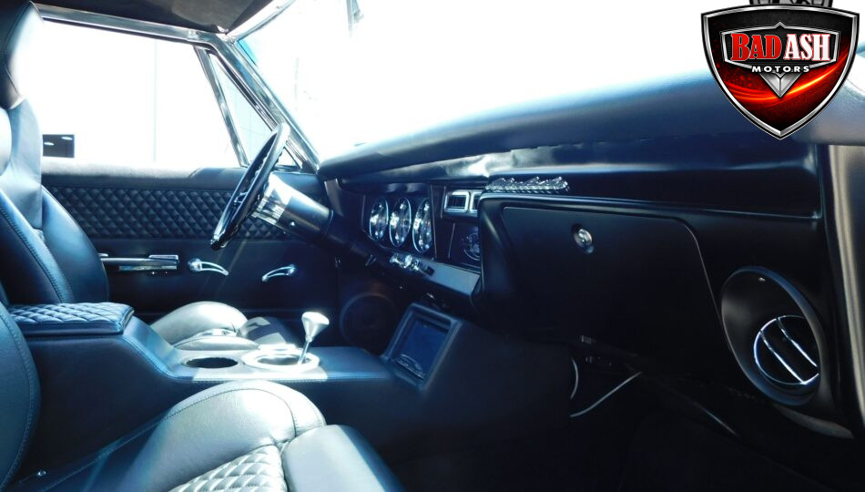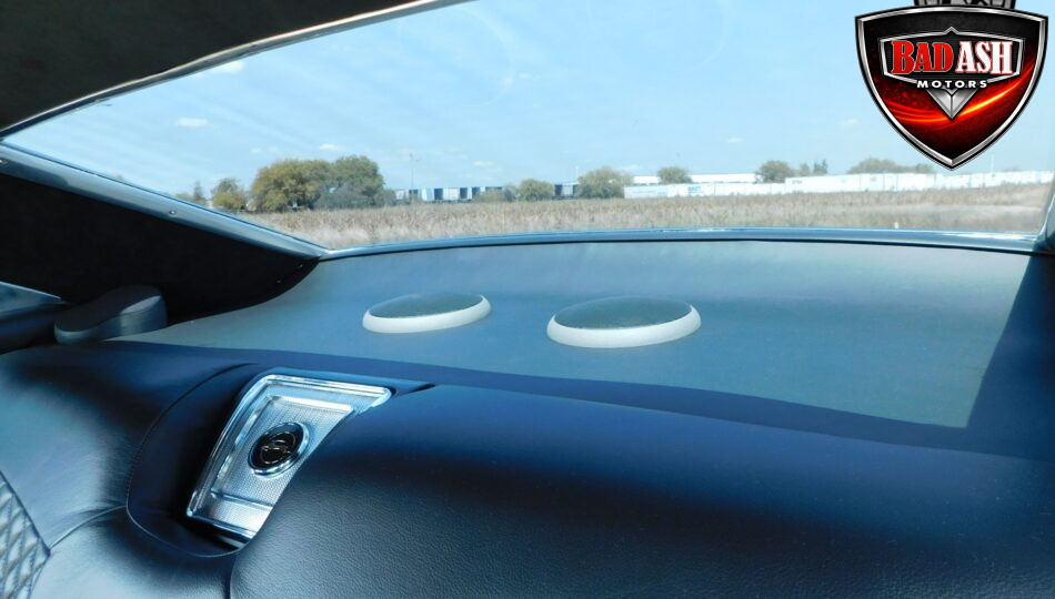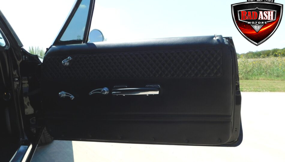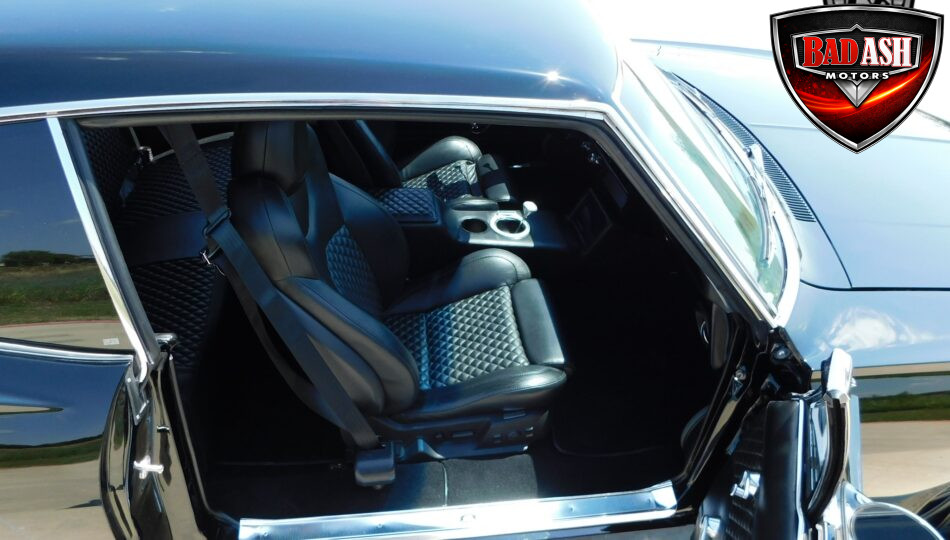 Inside, the blackout theme continues with custom Recaro power seats, new carpeting, a refinished dash with Dakota Digital gauges, Vintage Air A/C, power windows, and a Pioneer touchscreen stereo.