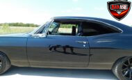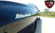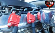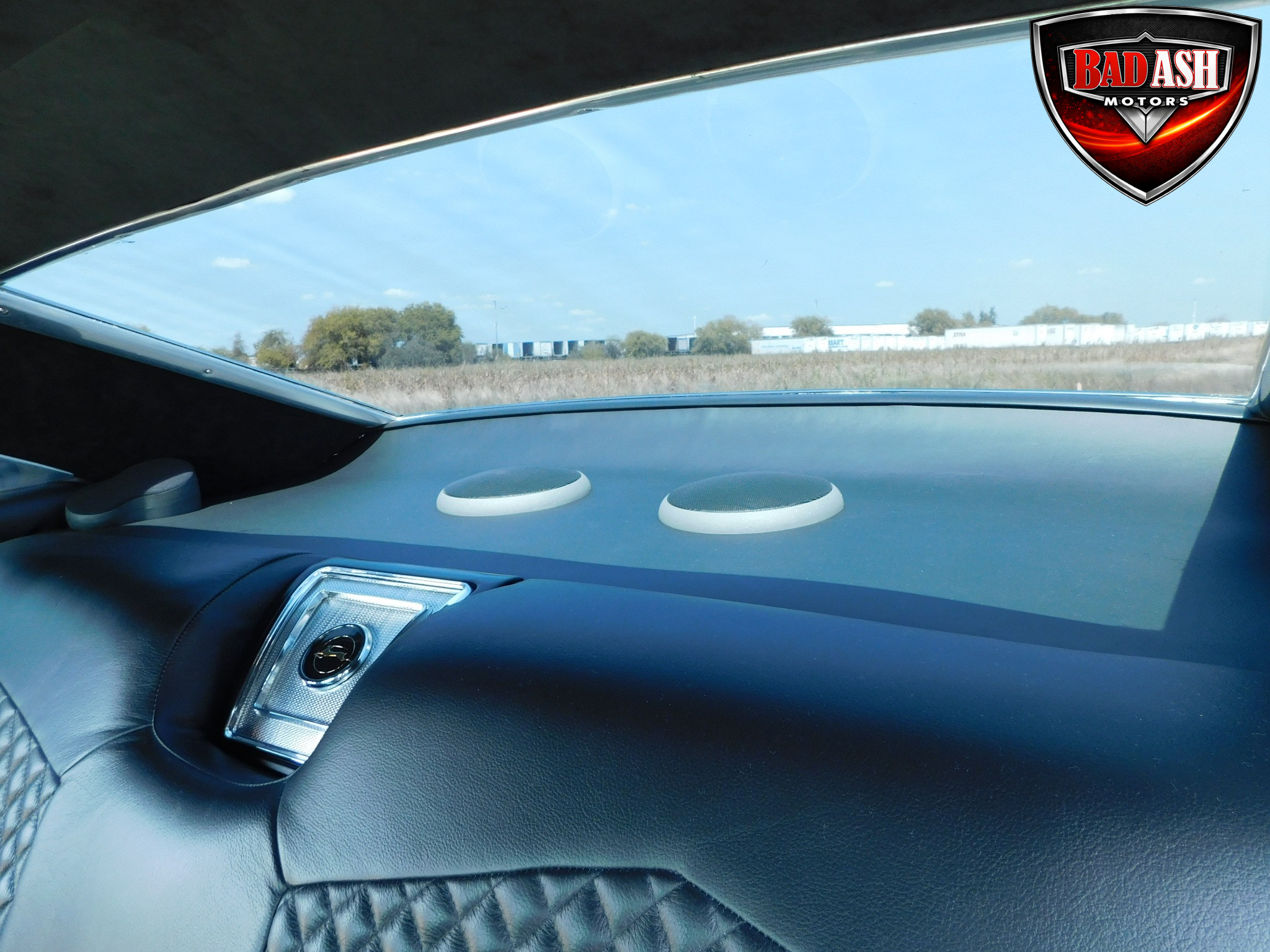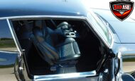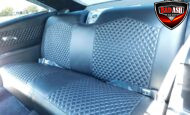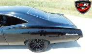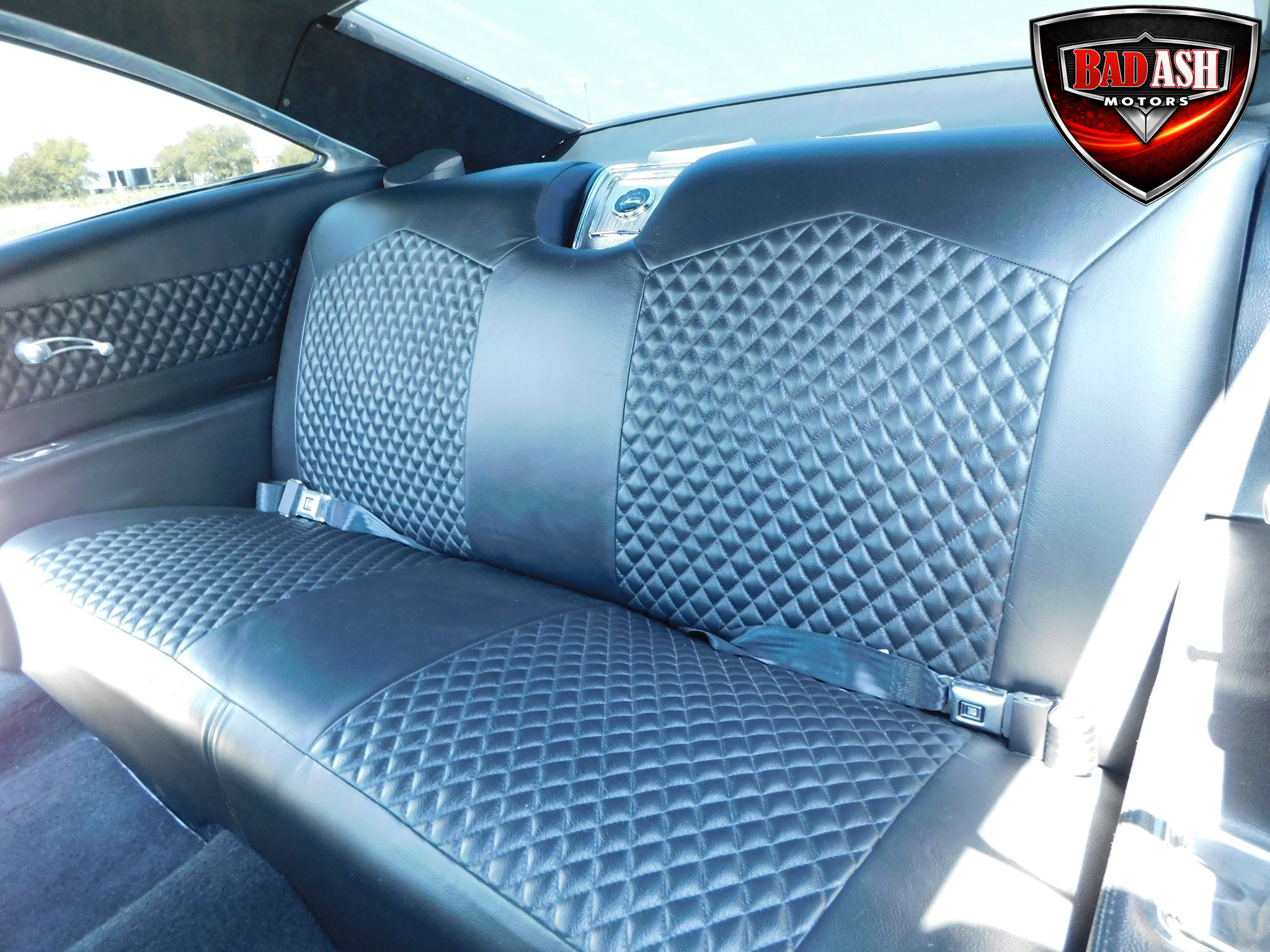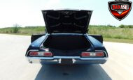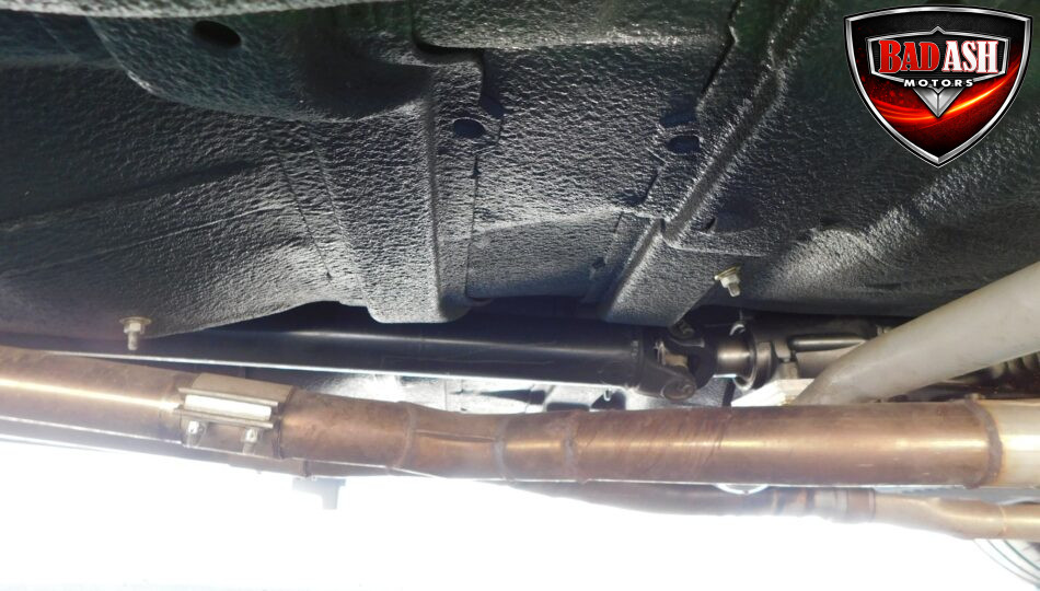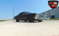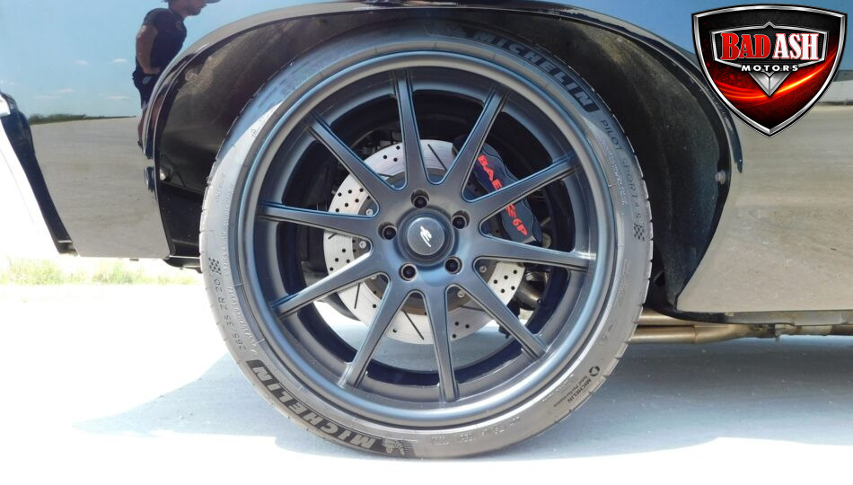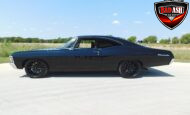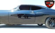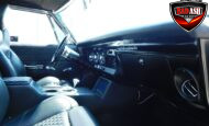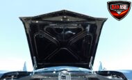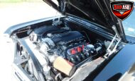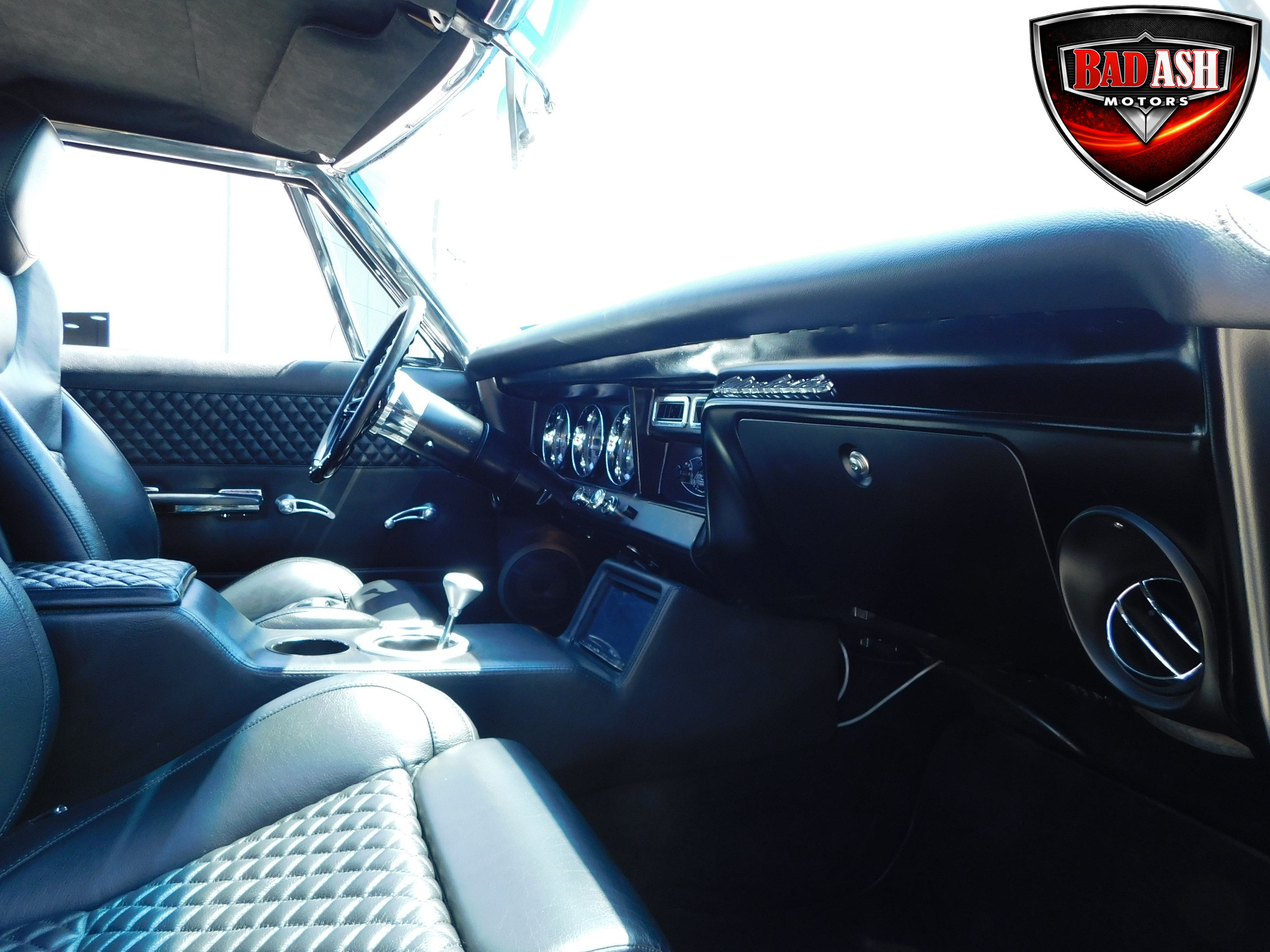 Inside, the blackout theme continues with custom Recaro power seats, new carpeting, a refinished dash with Dakota Digital gauges, Vintage Air A/C, power windows, and a Pioneer touchscreen stereo.