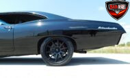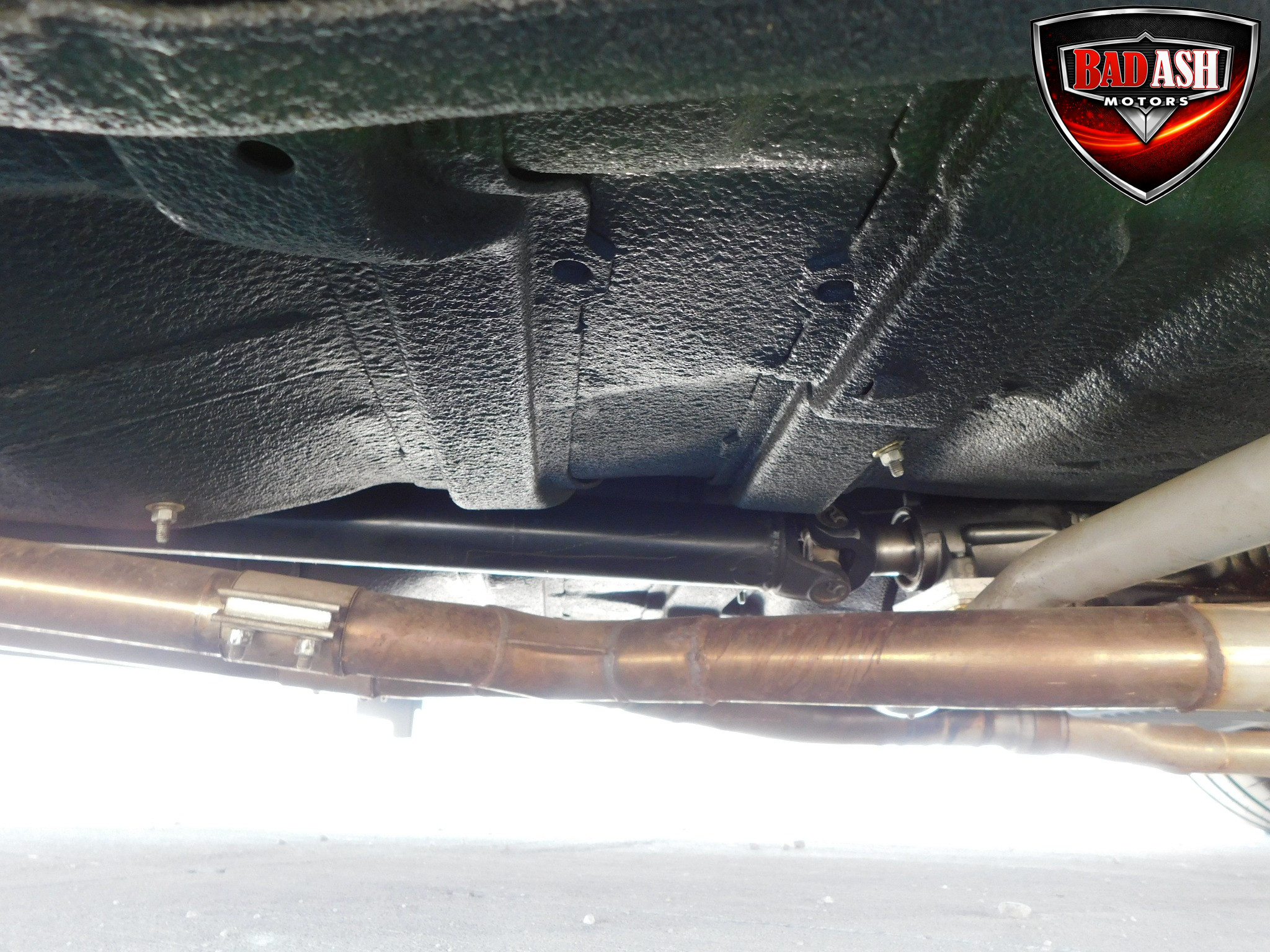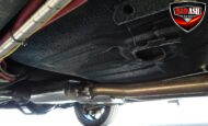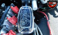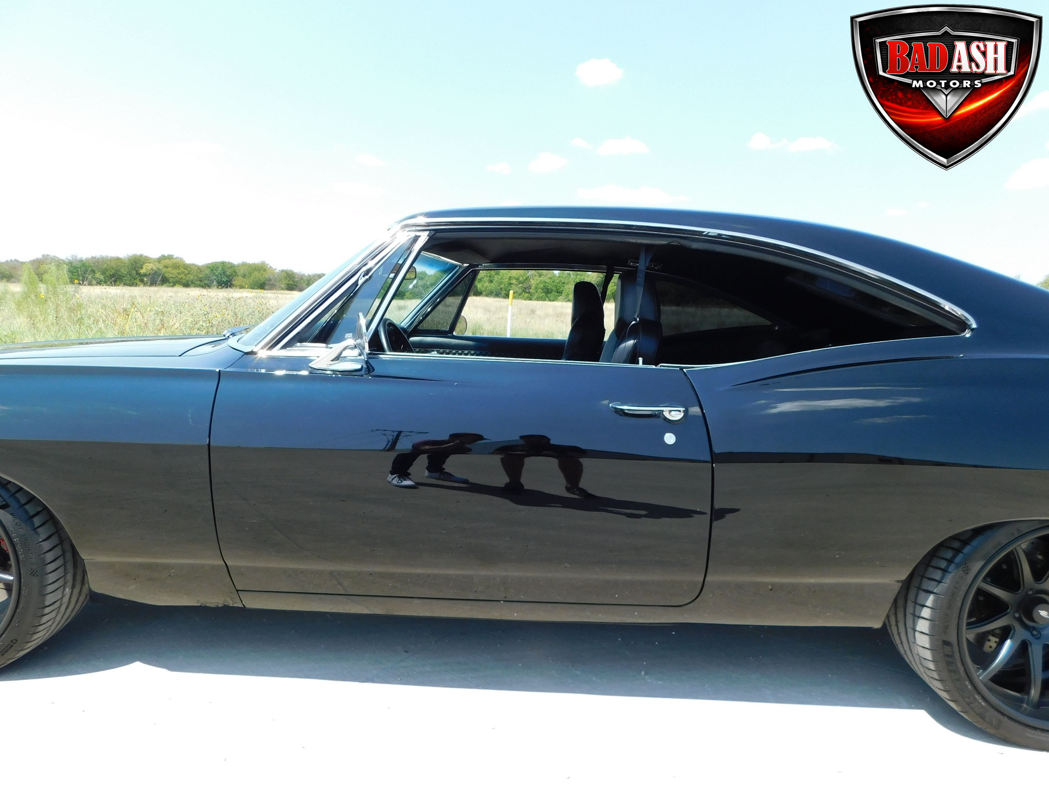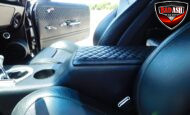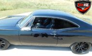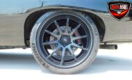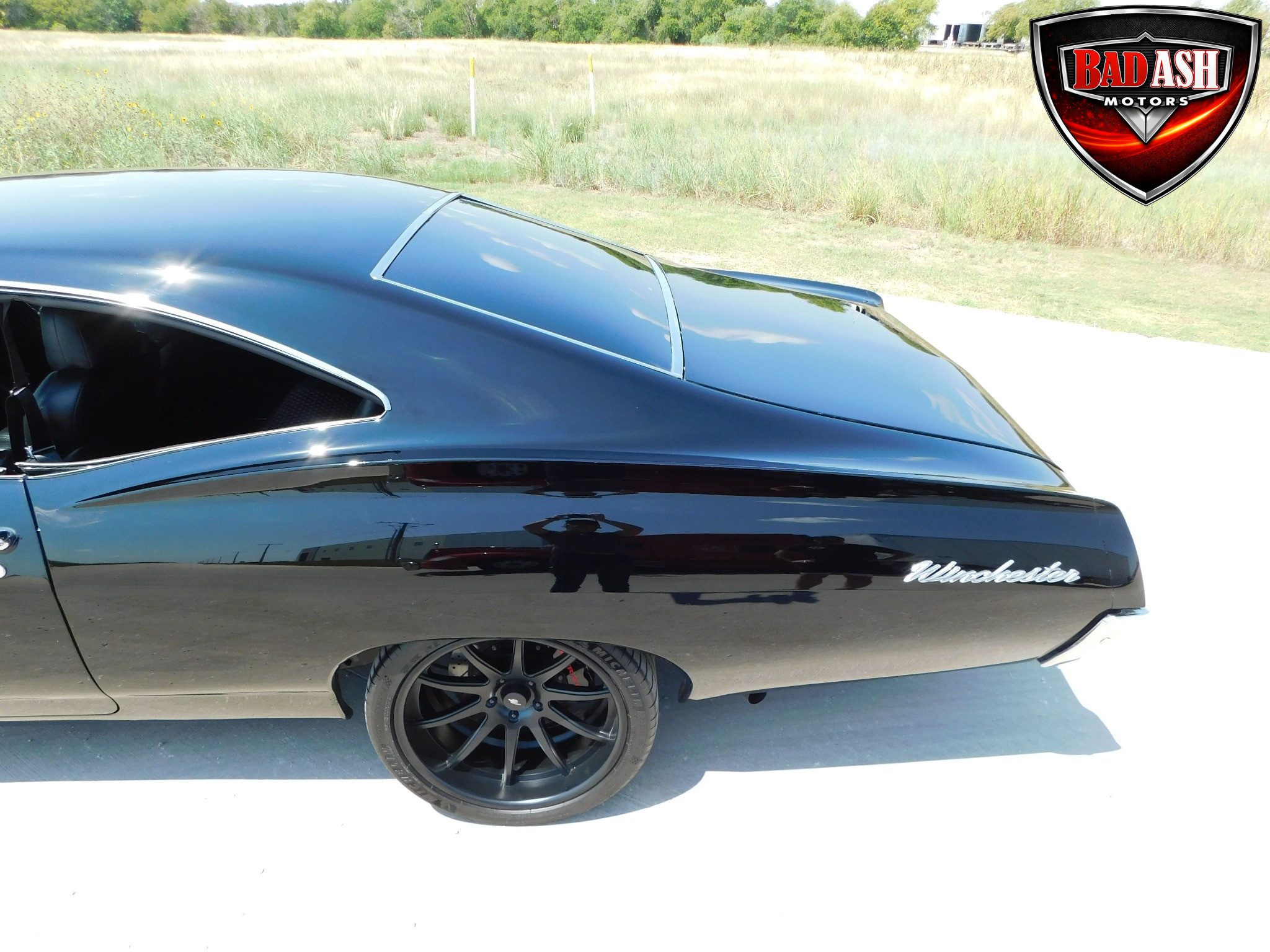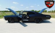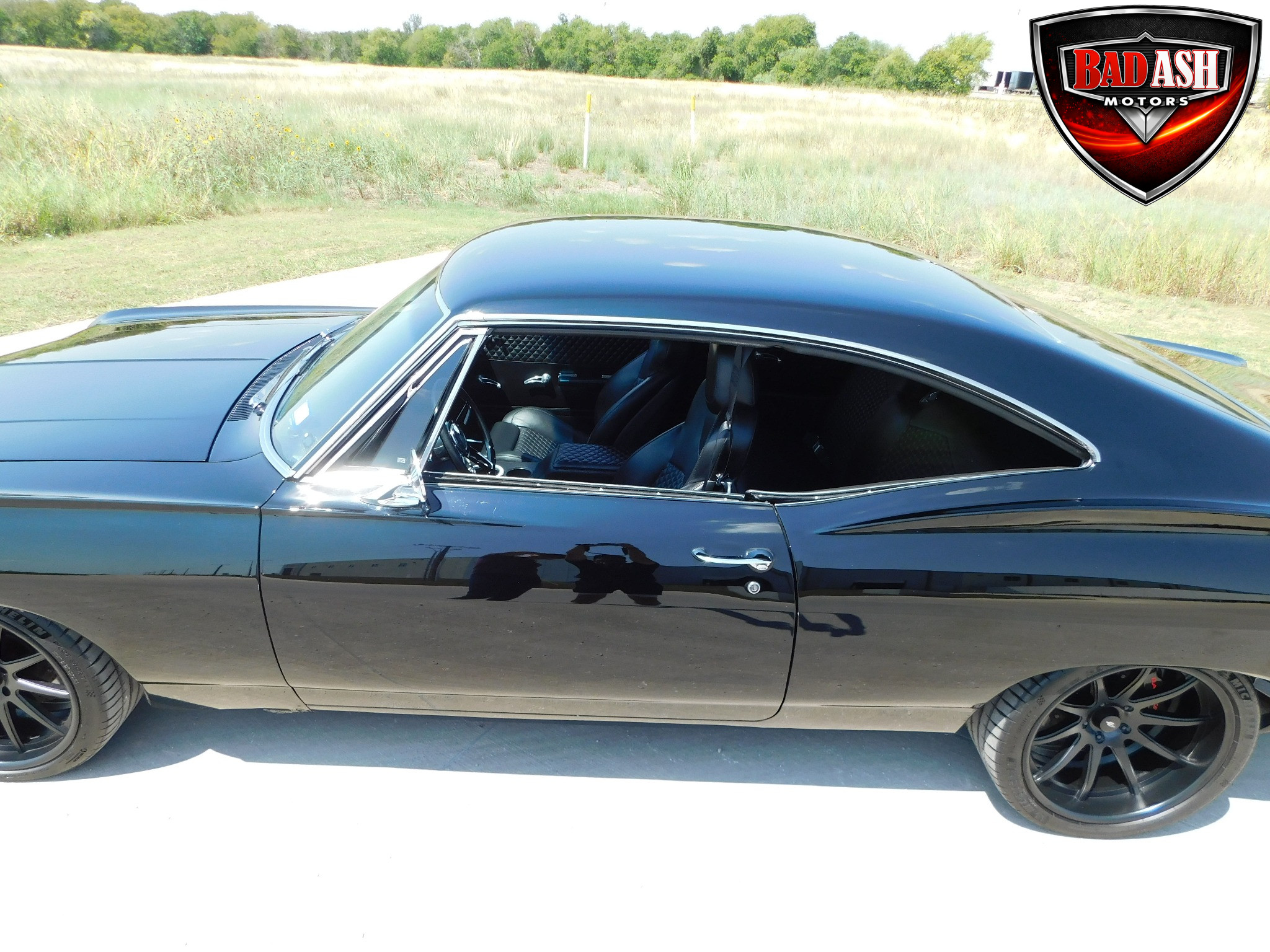 Inside, the blackout theme continues with custom Recaro power seats, new carpeting, a refinished dash with Dakota Digital gauges, Vintage Air A/C, power windows, and a Pioneer touchscreen stereo.