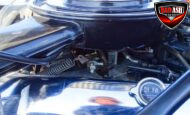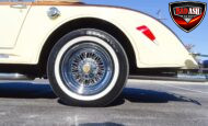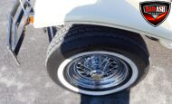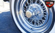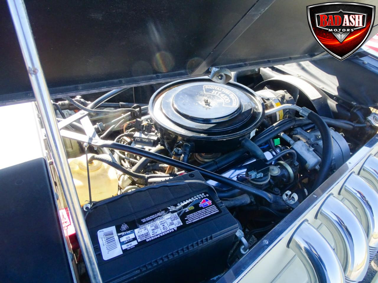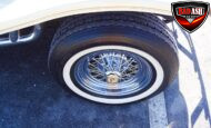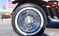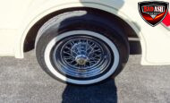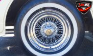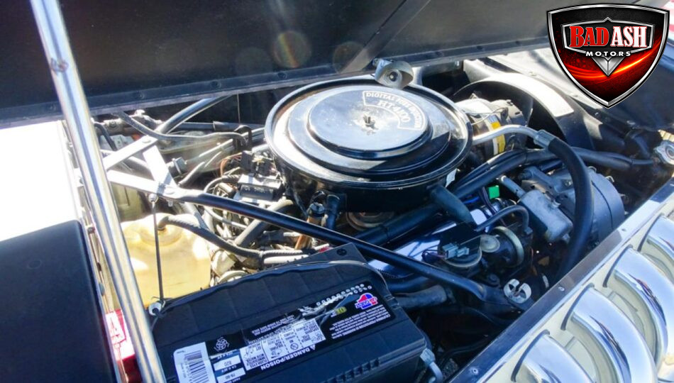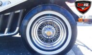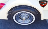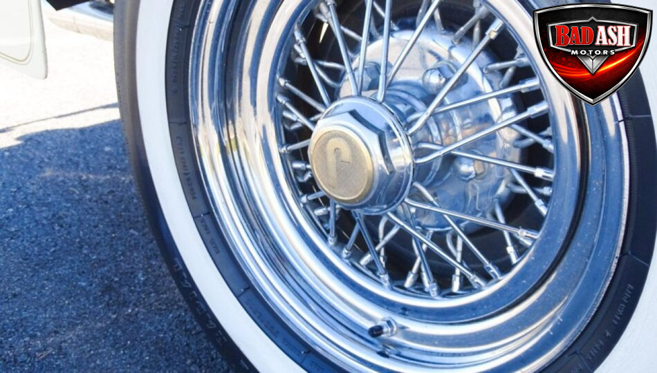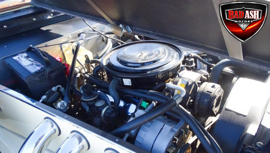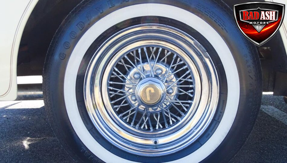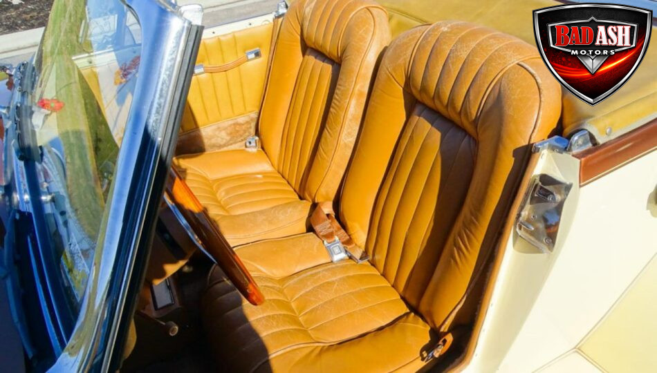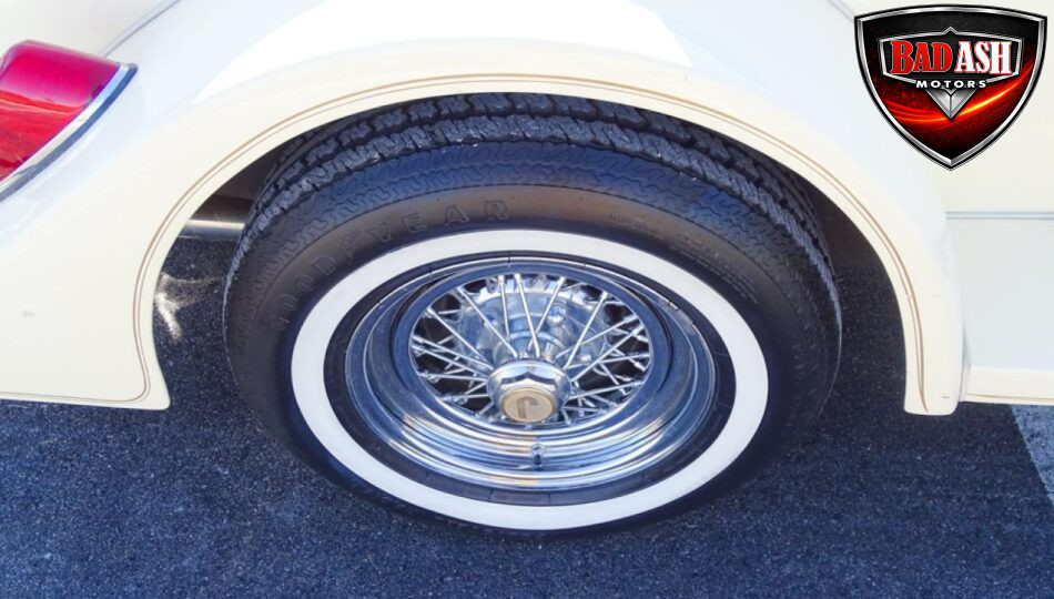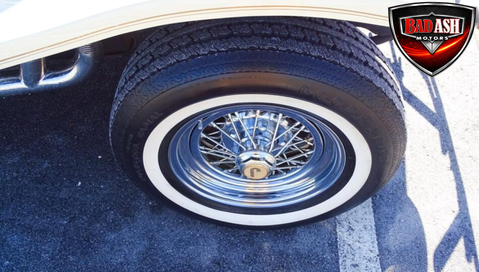 Power comes from a Cadillac V8 paired with a Cadillac automatic transmission, providing effortless cruising. The car is generously equipped with features including AM/FM radio, cassette player, manual convertible top, power steering, power brakes, power windows, power locks, tilt steering wheel, seat belts, leather interior, whitewall radial tires, and classic wire wheels.