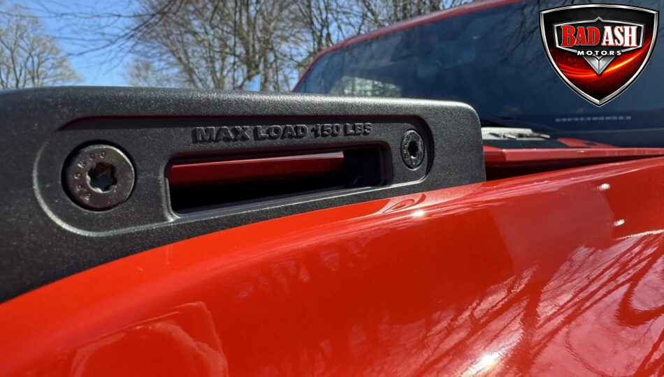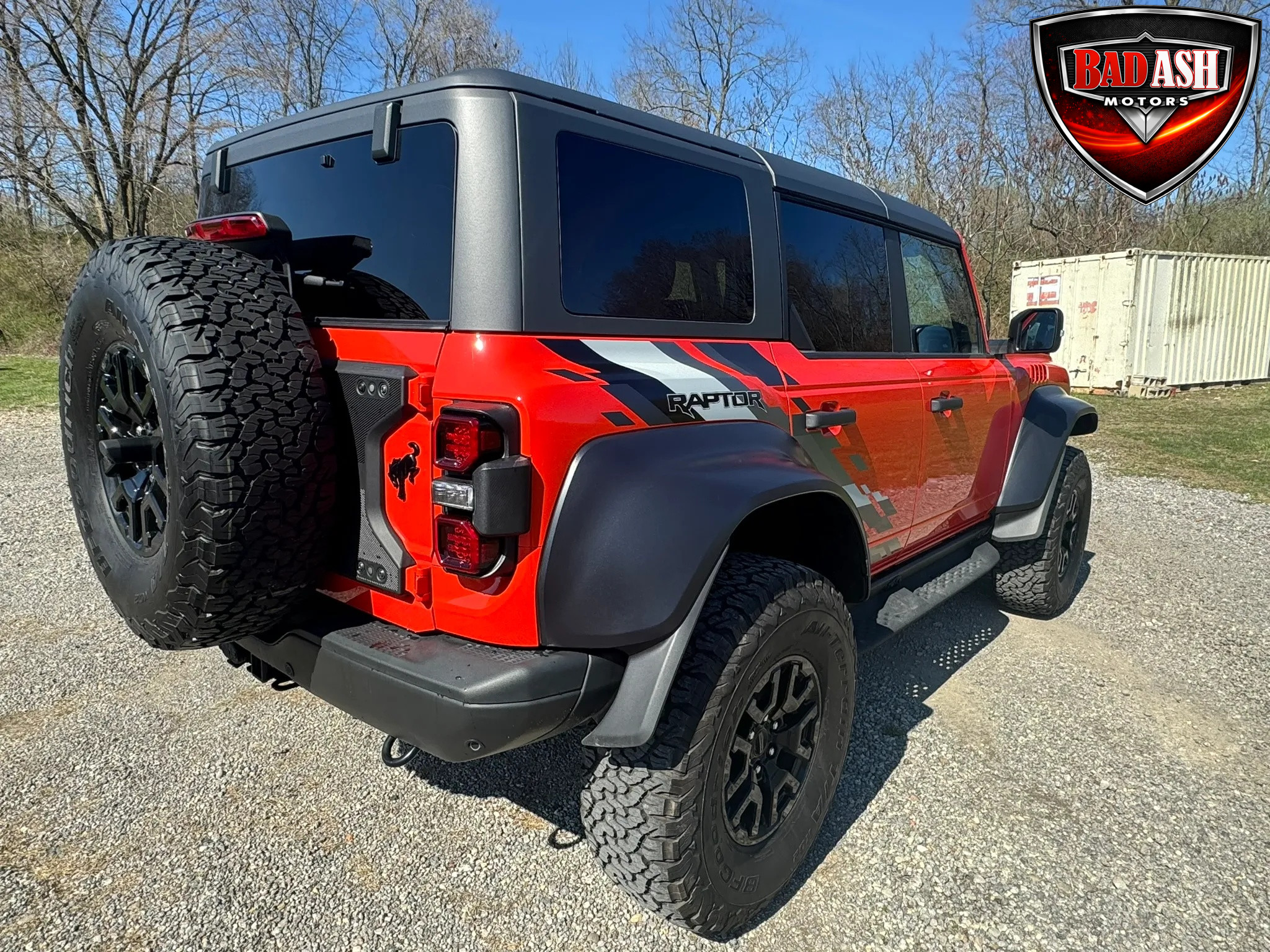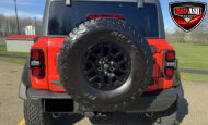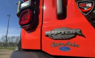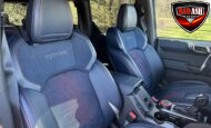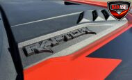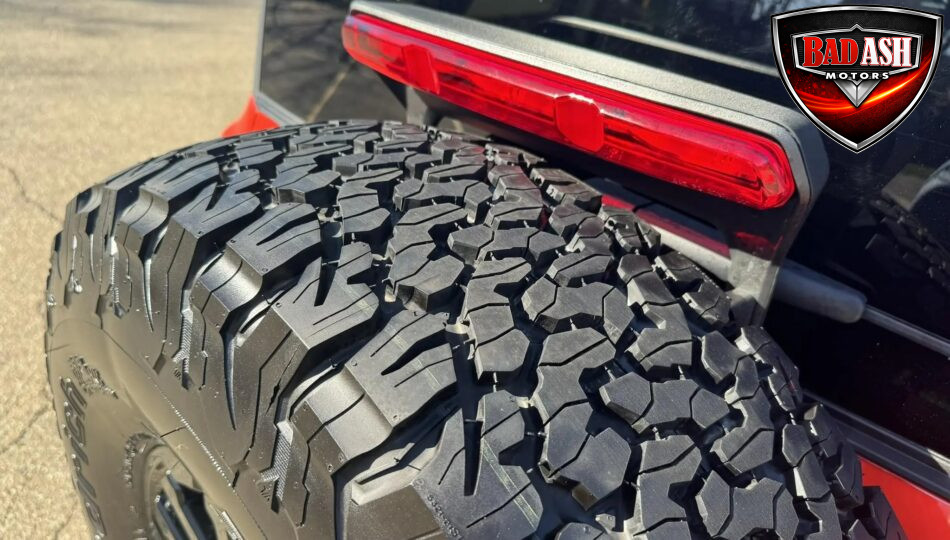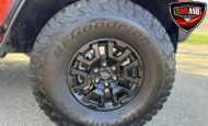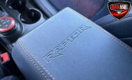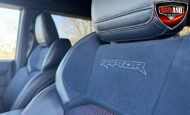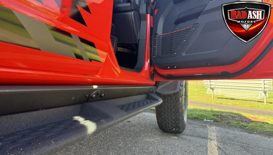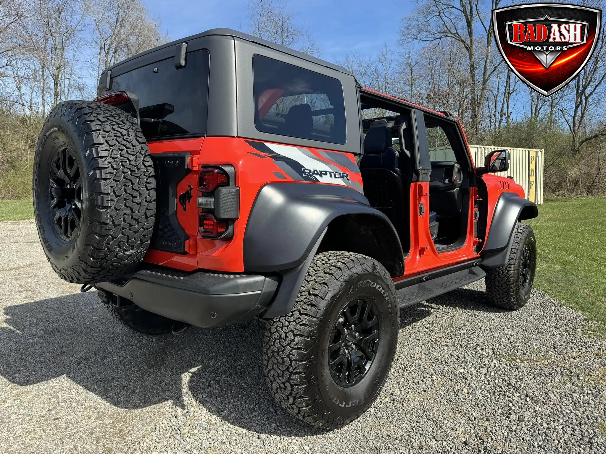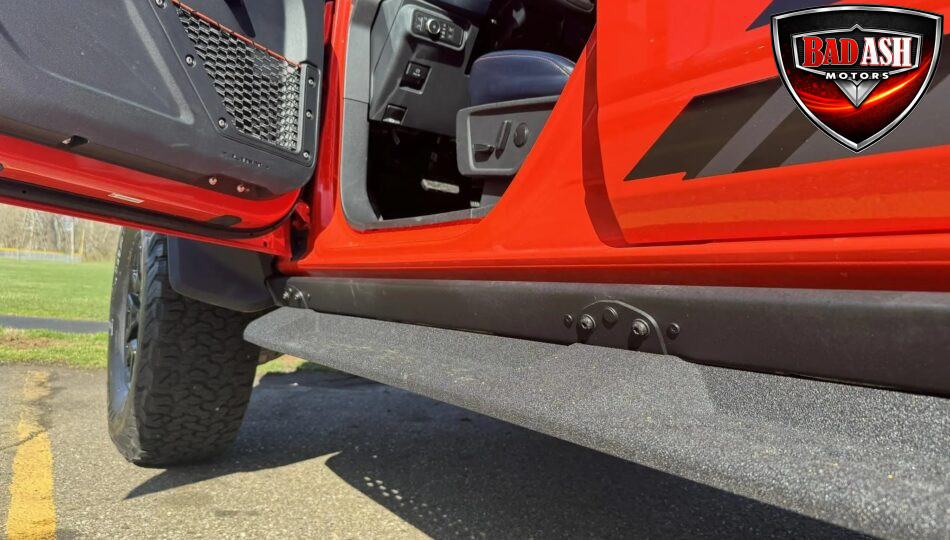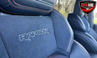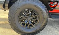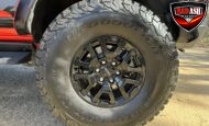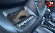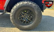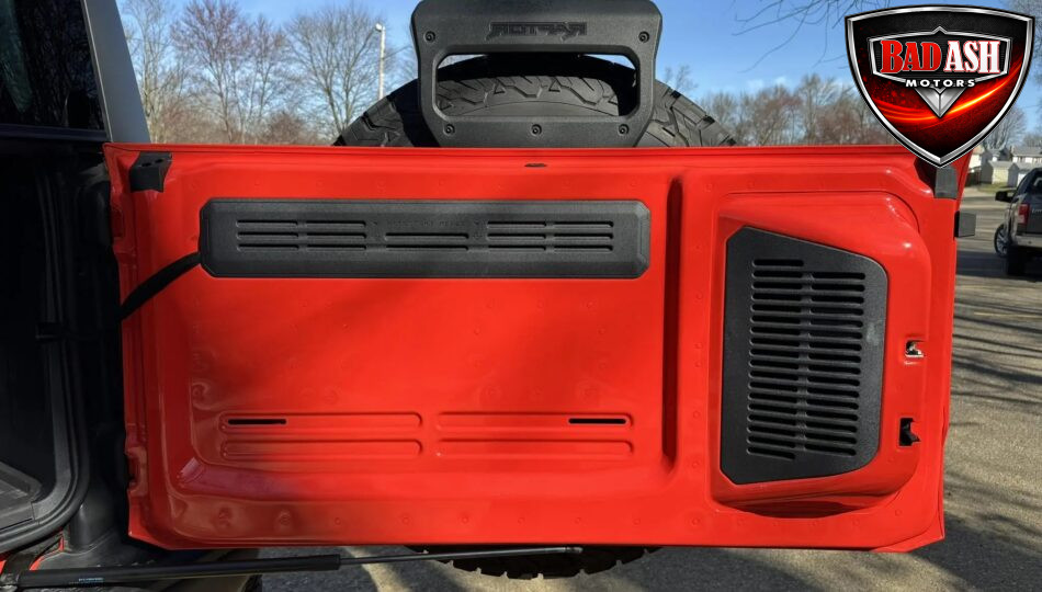 Exterior highlights include a Carbonized Gray hardtop, Raptor-specific hood, fender flares and vents, LED lighting, heavy-duty modular front bumper, running boards, receiver hitch, rock rails, metal bash plates, and removable doors. It rides on 17″ black alloy wheels with 37″ BFGoodrich All-Terrain KO2 tires and a matching full-size spare.