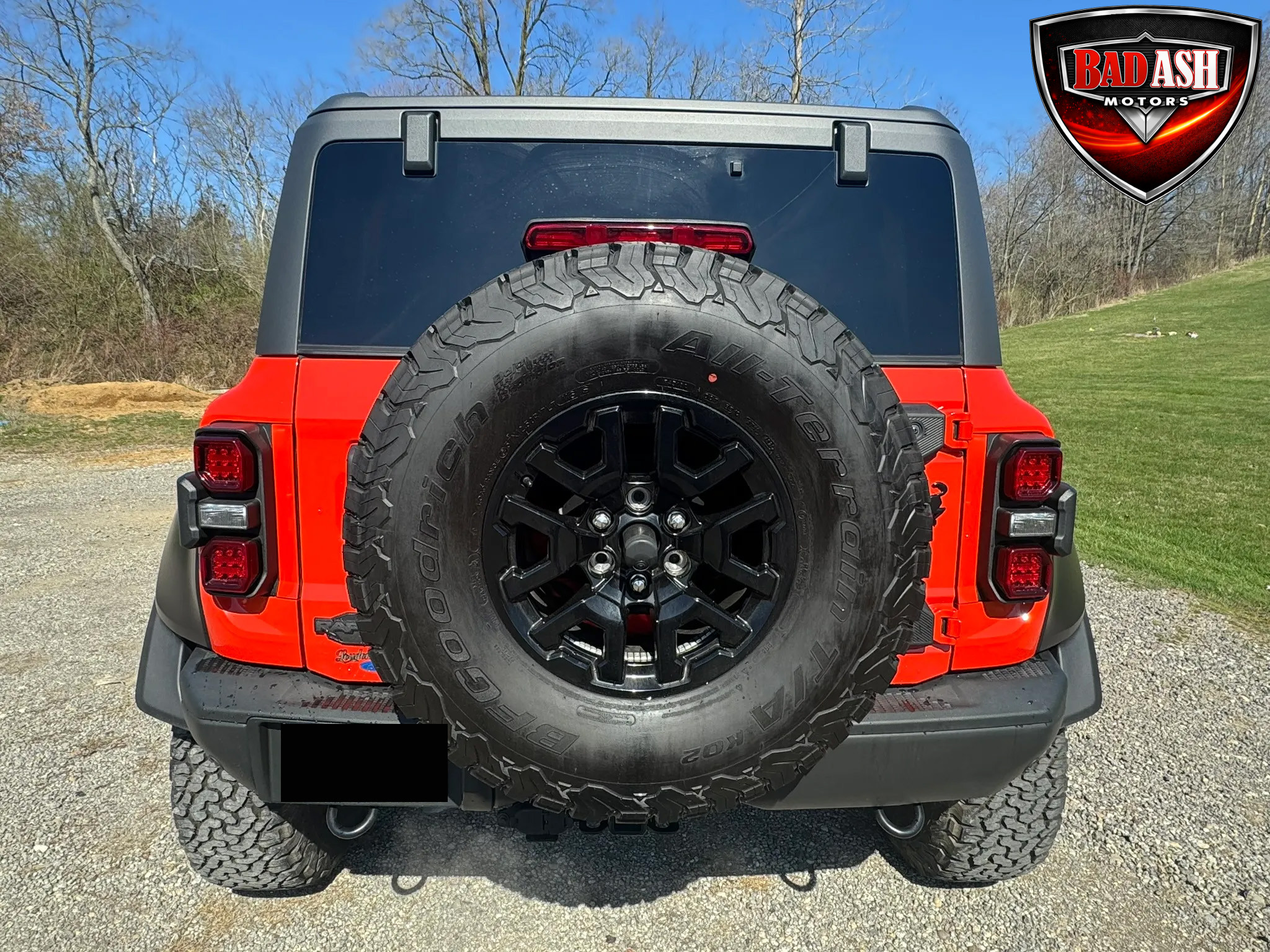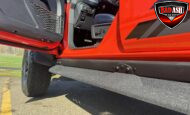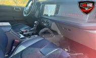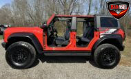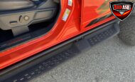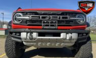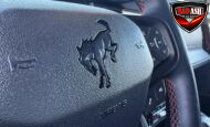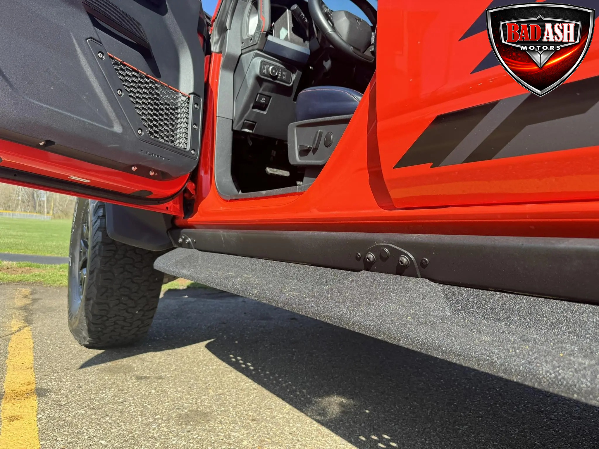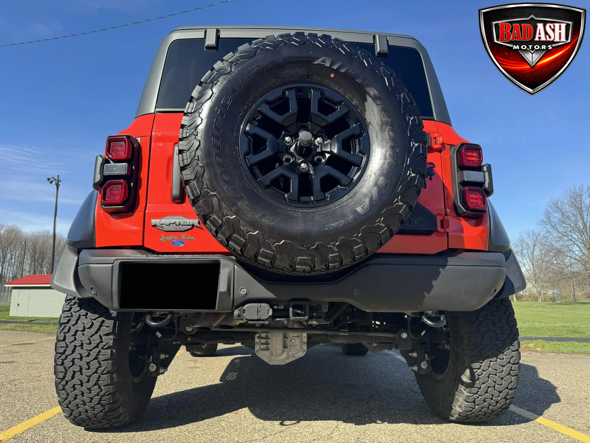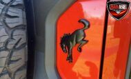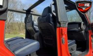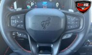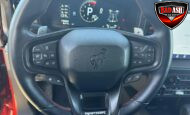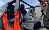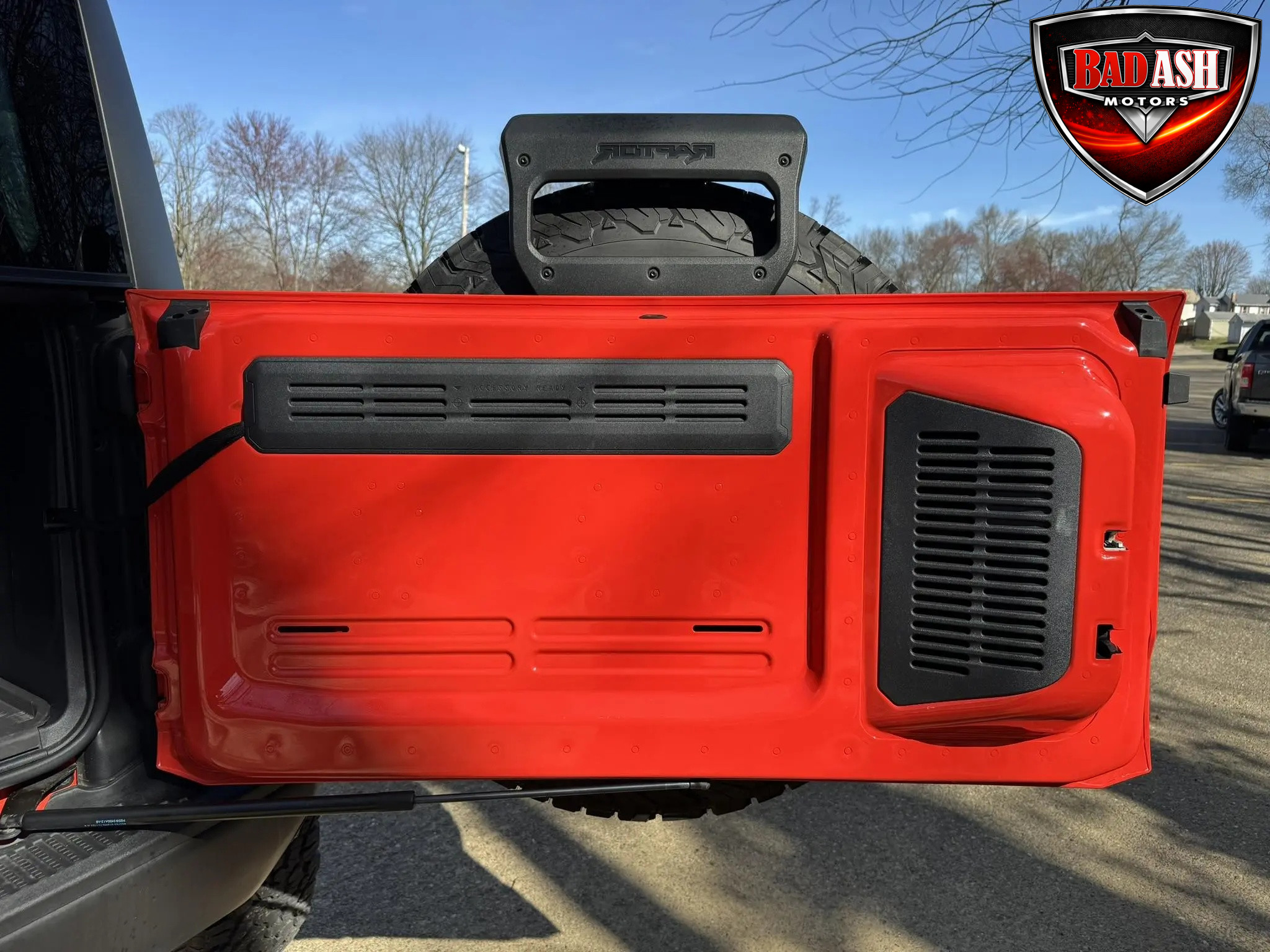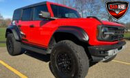 Exterior highlights include a Carbonized Gray hardtop, Raptor-specific hood, fender flares and vents, LED lighting, heavy-duty modular front bumper, running boards, receiver hitch, rock rails, metal bash plates, and removable doors. It rides on 17″ black alloy wheels with 37″ BFGoodrich All-Terrain KO2 tires and a matching full-size spare.