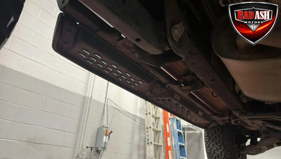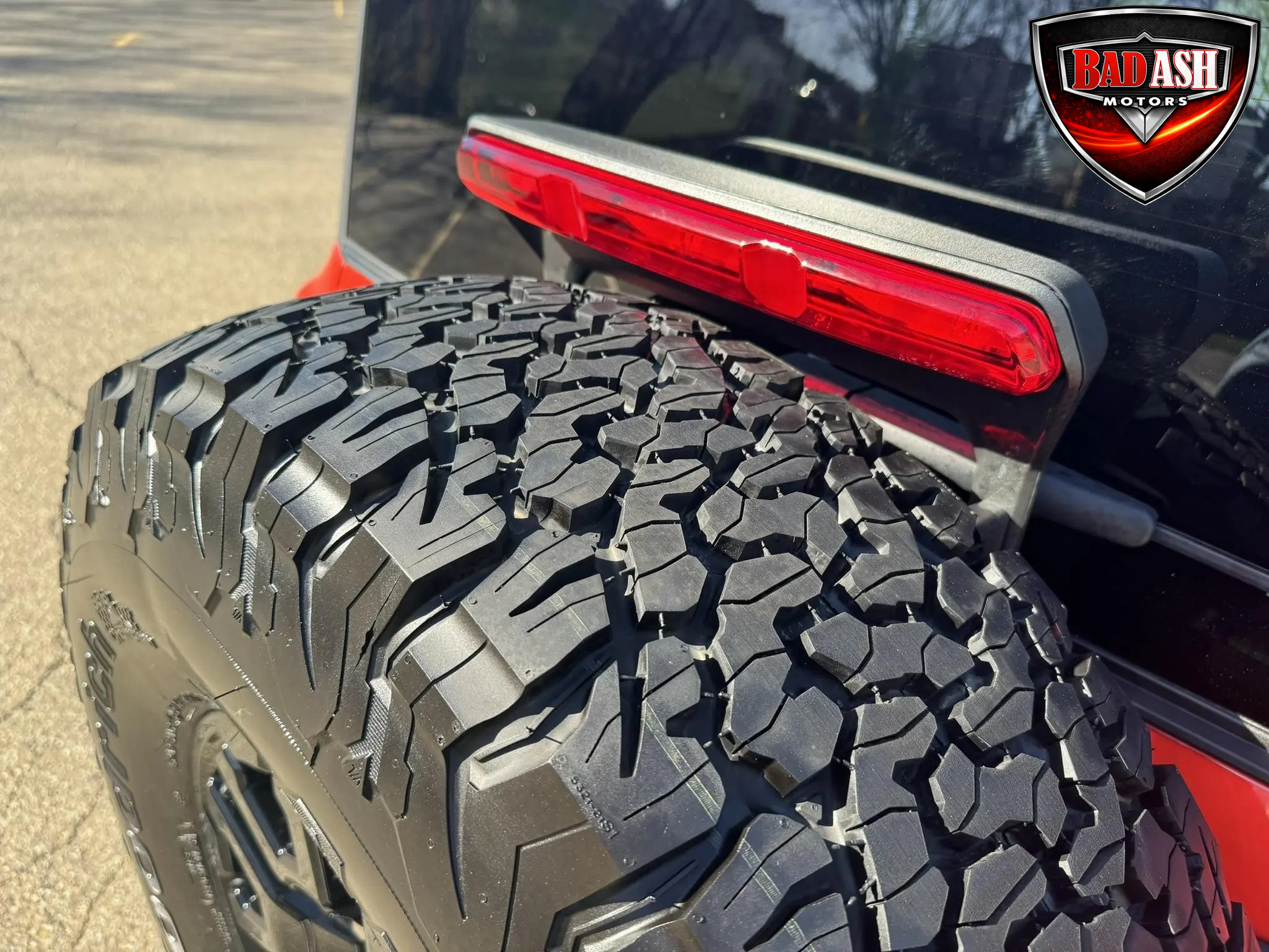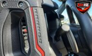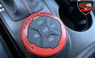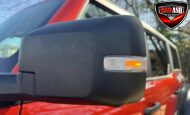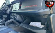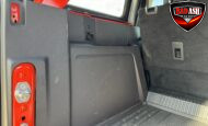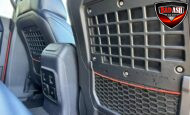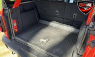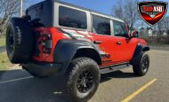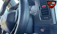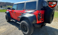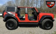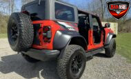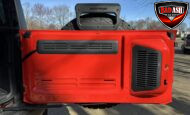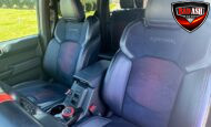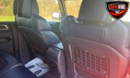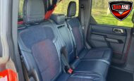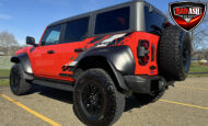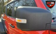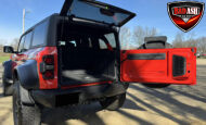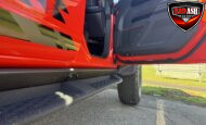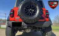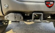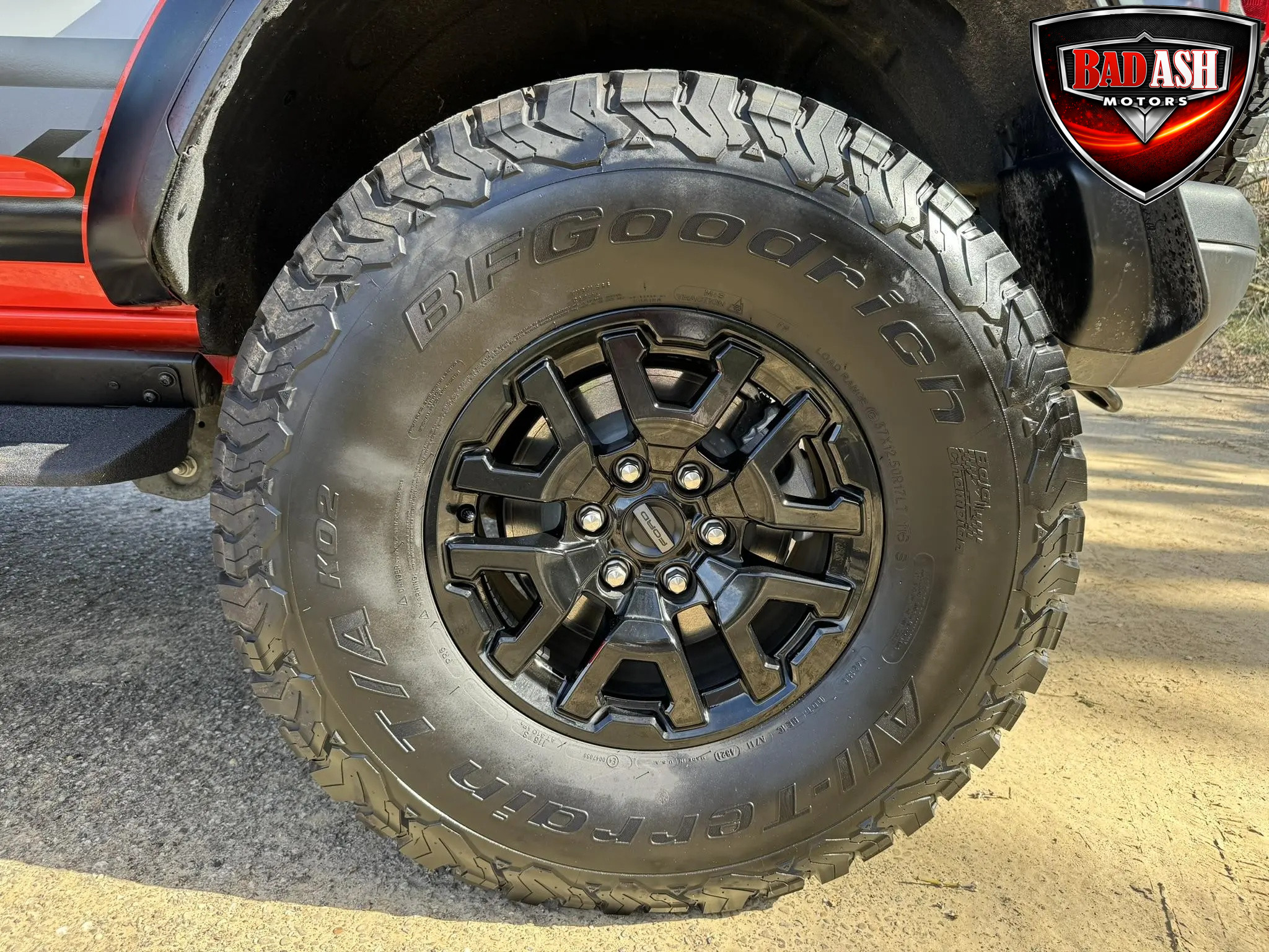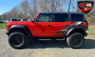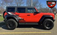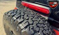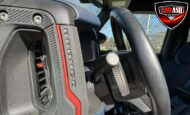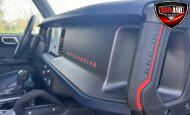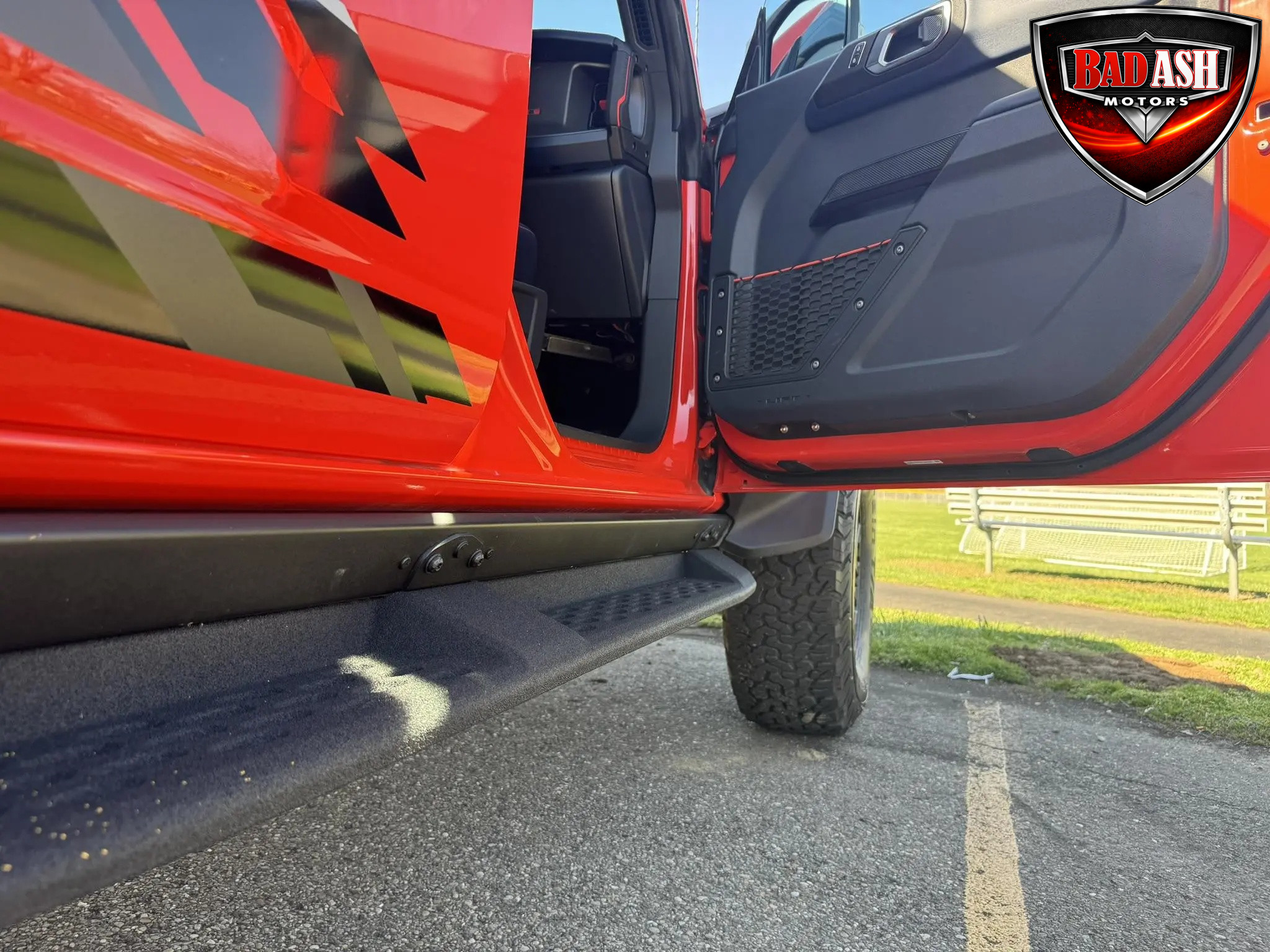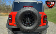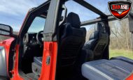 Exterior highlights include a Carbonized Gray hardtop, Raptor-specific hood, fender flares and vents, LED lighting, heavy-duty modular front bumper, running boards, receiver hitch, rock rails, metal bash plates, and removable doors. It rides on 17″ black alloy wheels with 37″ BFGoodrich All-Terrain KO2 tires and a matching full-size spare.
