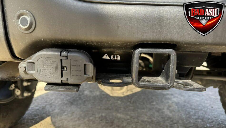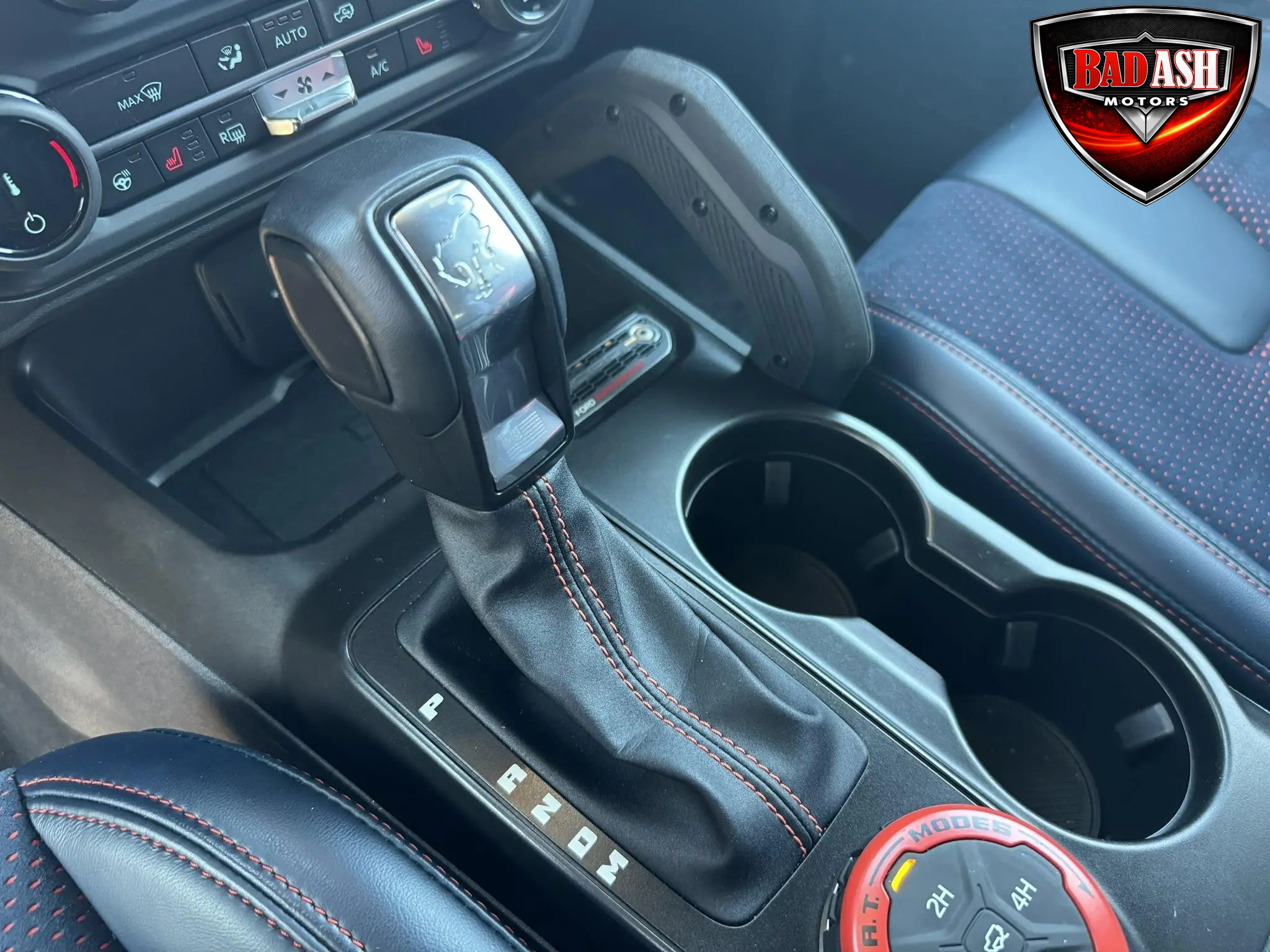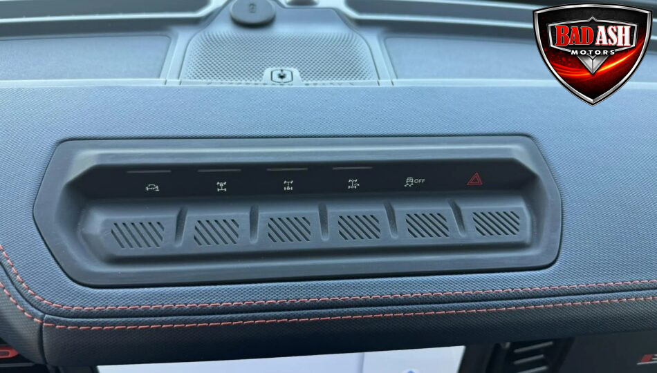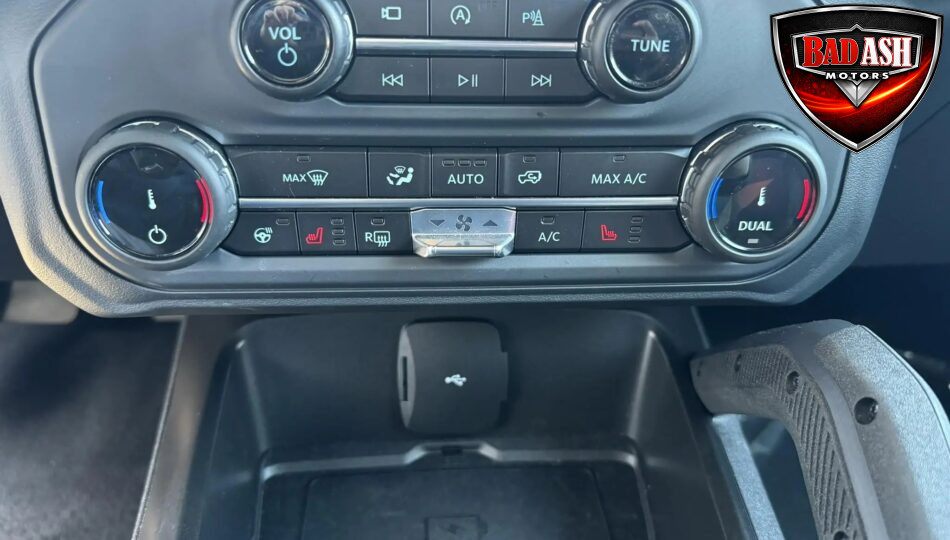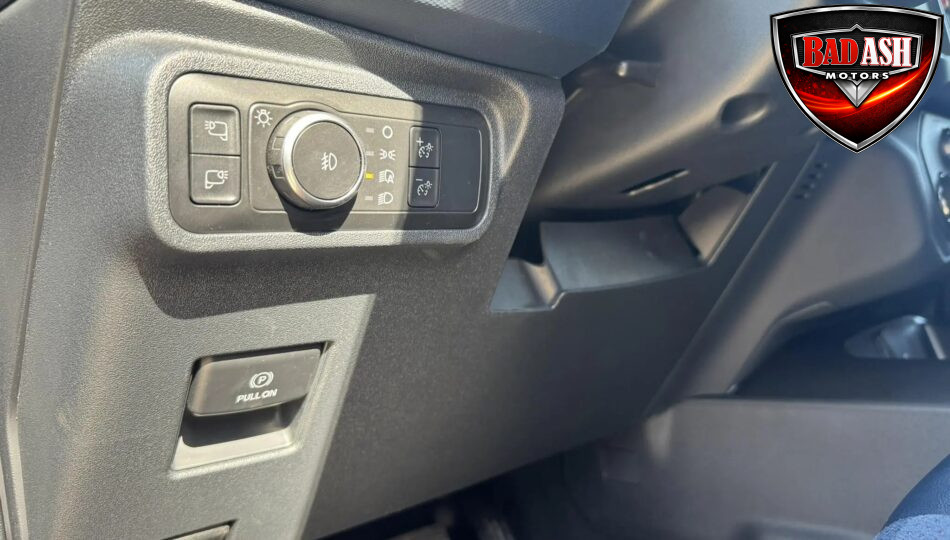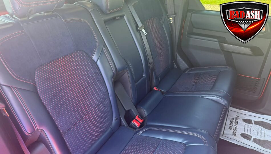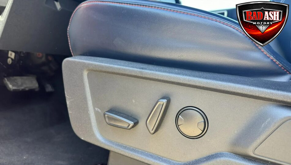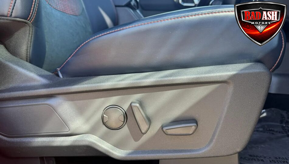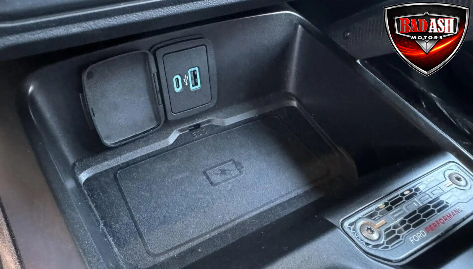 The cabin features heated power-adjustable seats, SYNC 4 infotainment with a 12″ touchscreen and navigation, Bang & Olufsen premium audio, 360-degree camera, adaptive cruise control, blind-spot monitoring, lane-keep assist, wireless charging, auxiliary switches, and dual-zone automatic climate control.