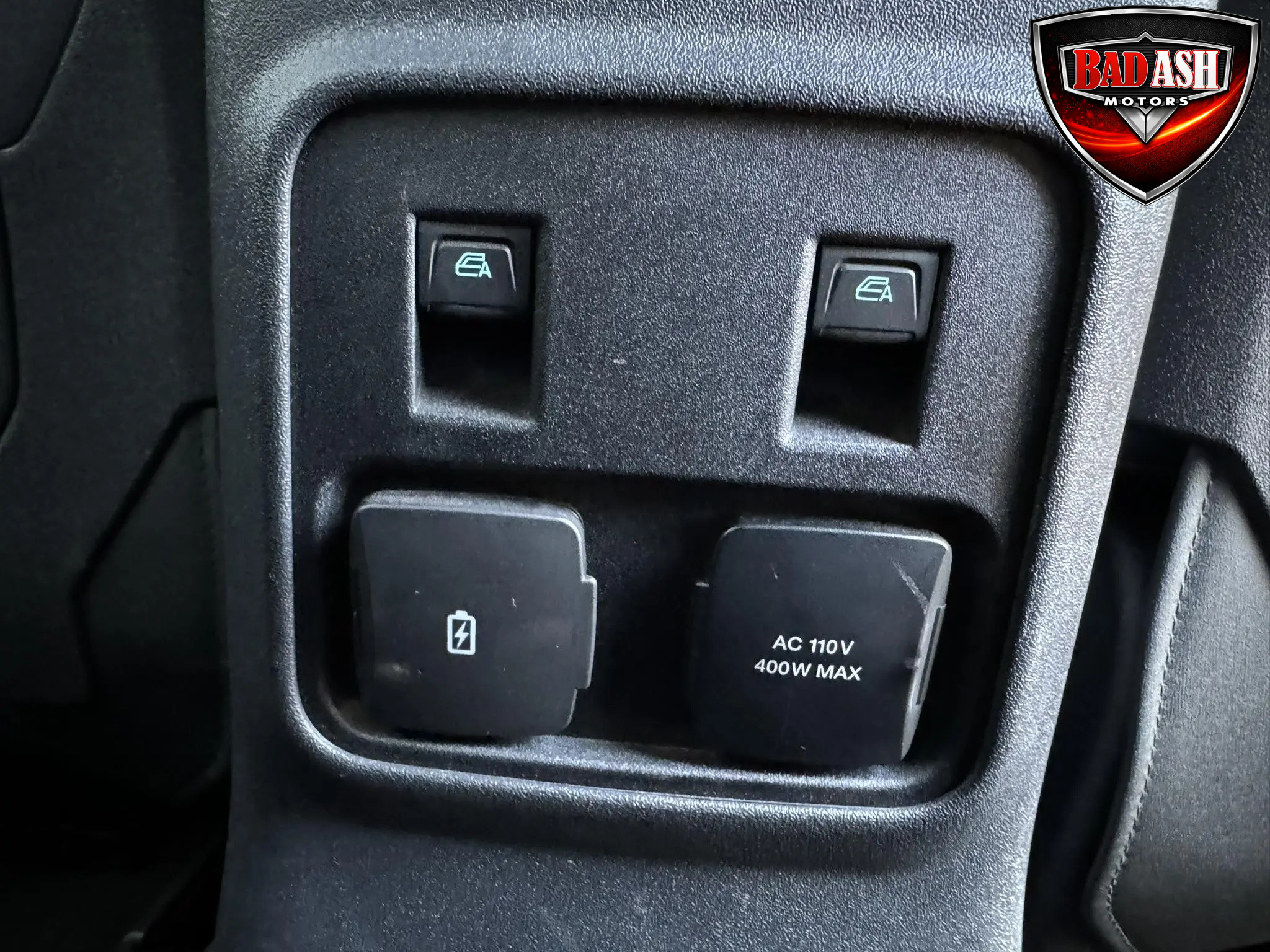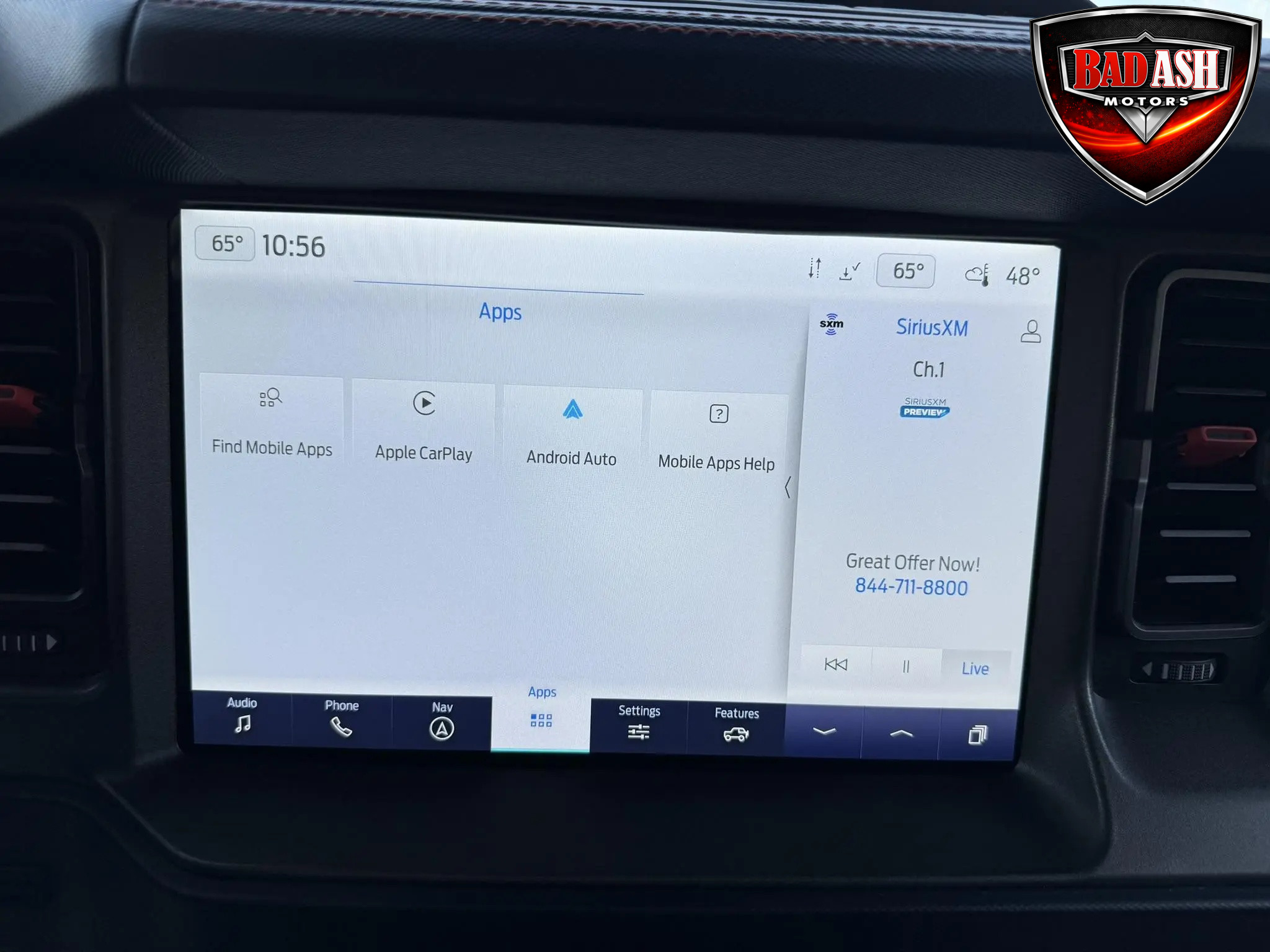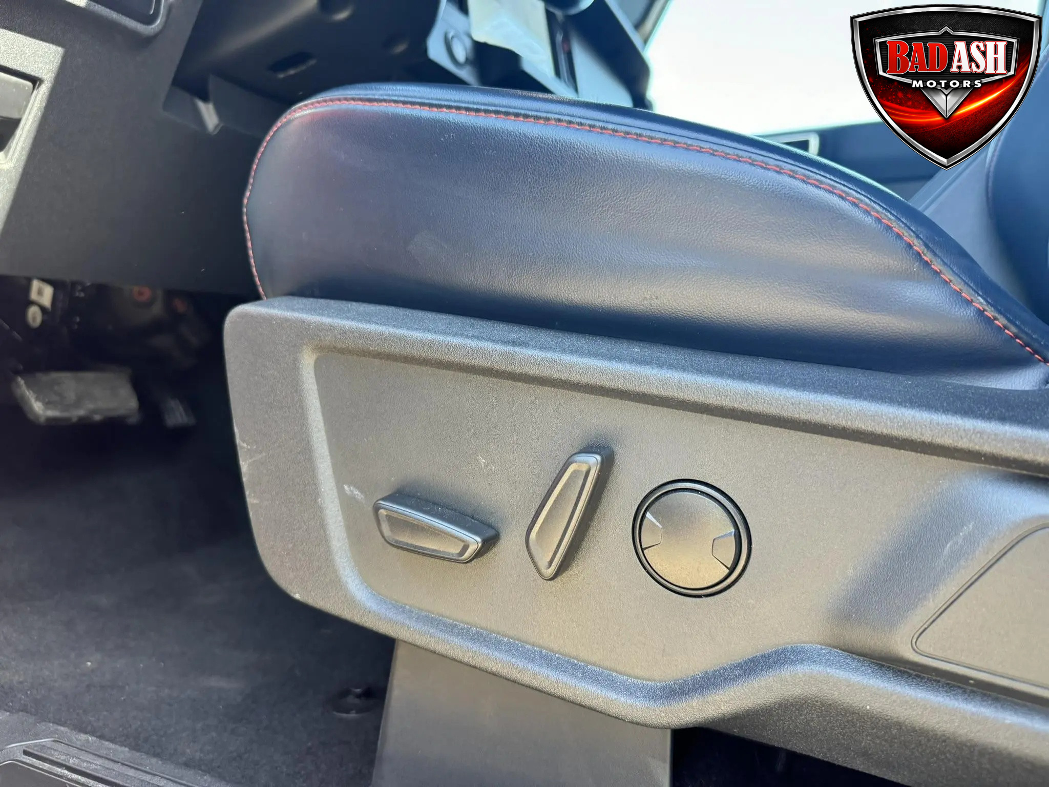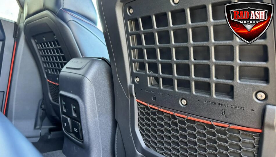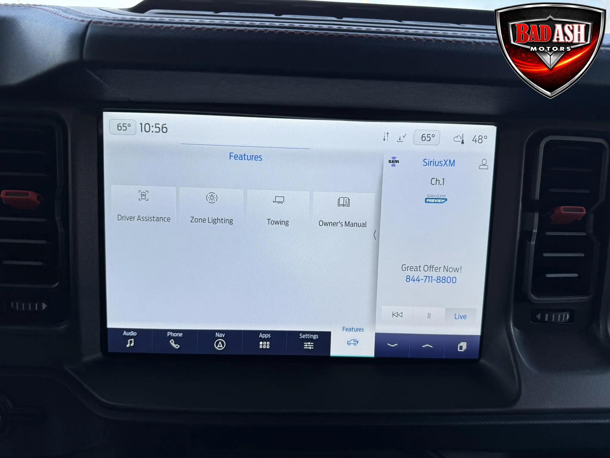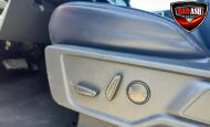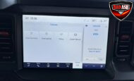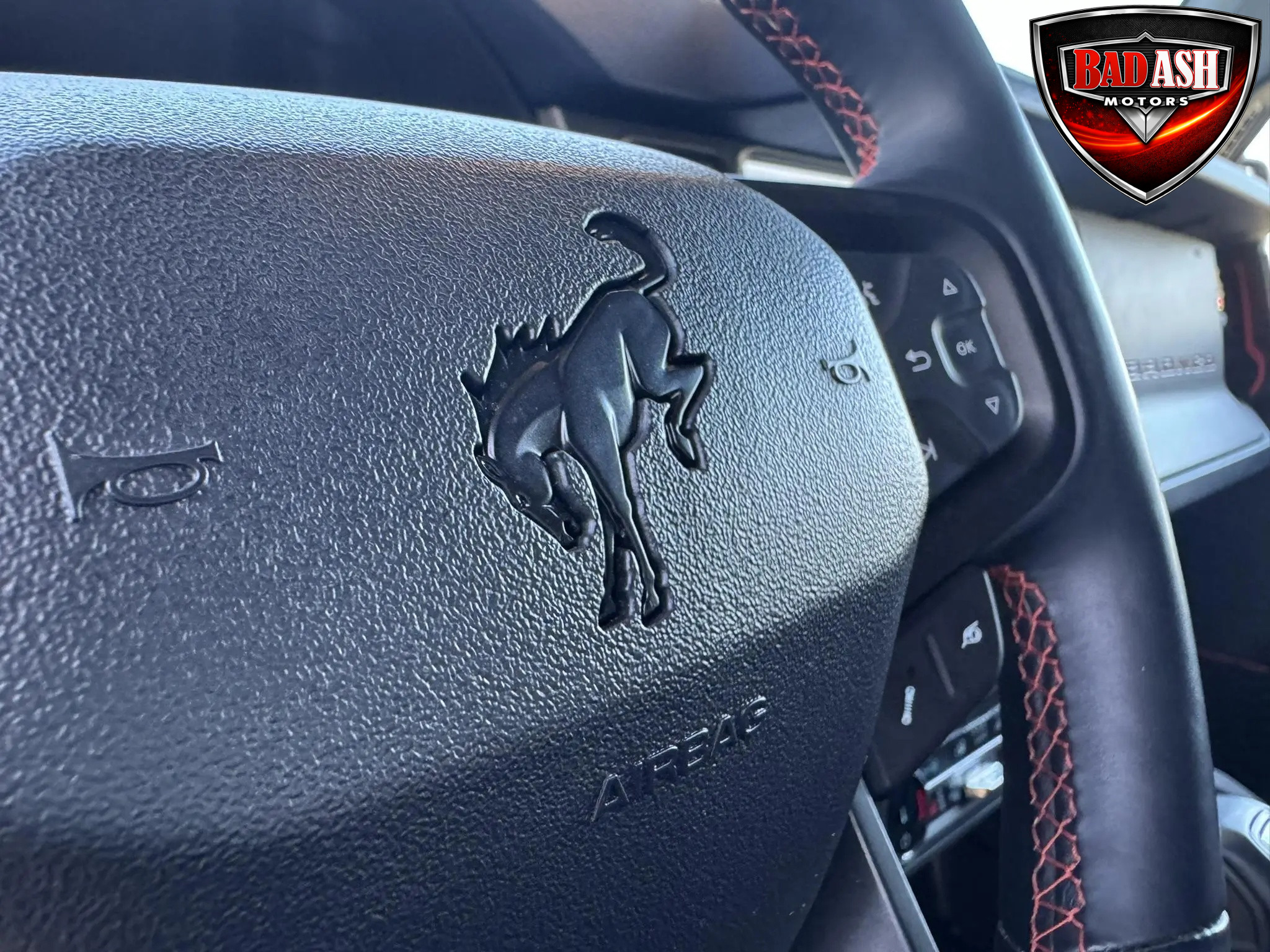 The cabin features heated power-adjustable seats, SYNC 4 infotainment with a 12″ touchscreen and navigation, Bang & Olufsen premium audio, 360-degree camera, adaptive cruise control, blind-spot monitoring, lane-keep assist, wireless charging, auxiliary switches, and dual-zone automatic climate control.