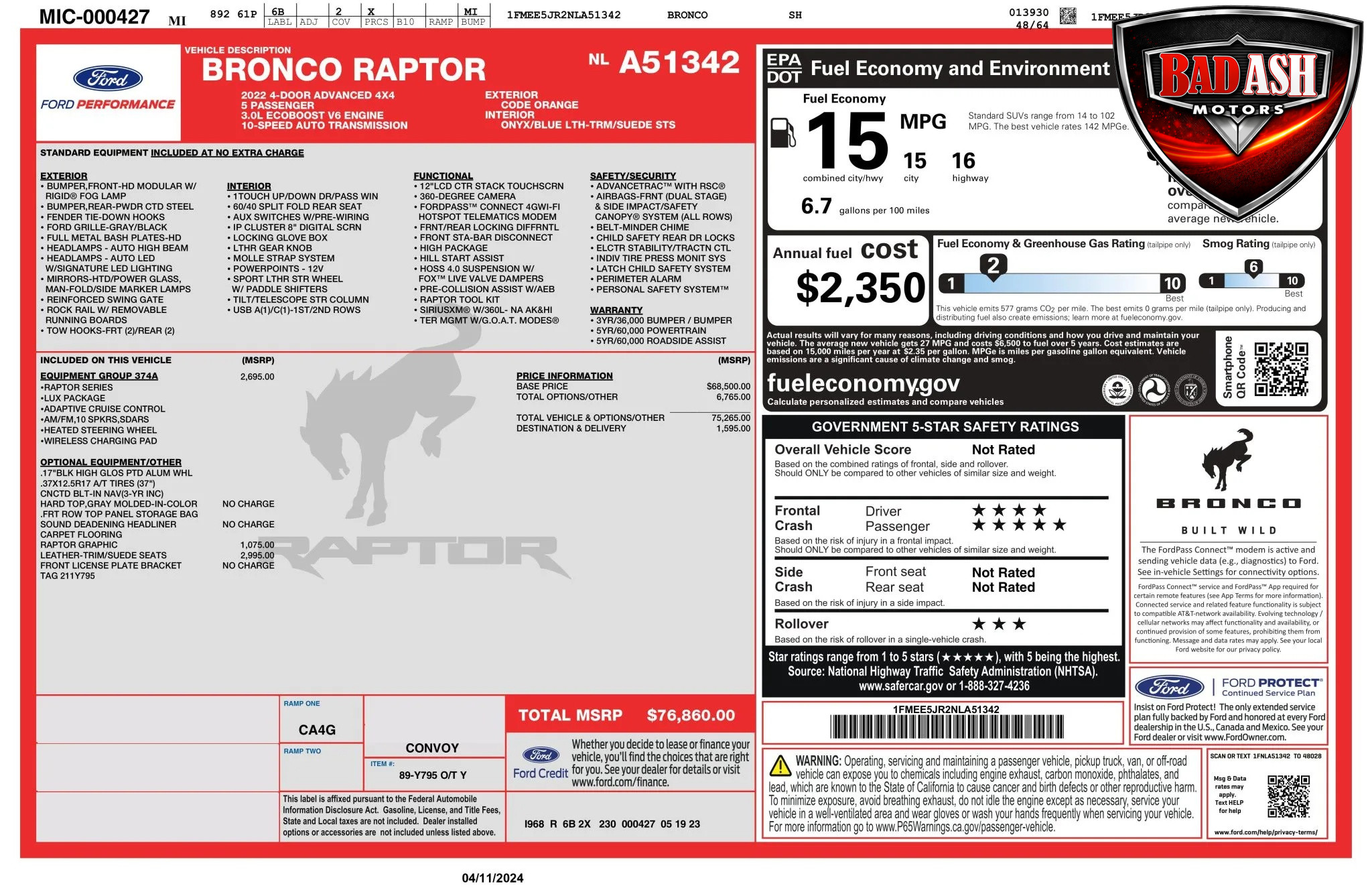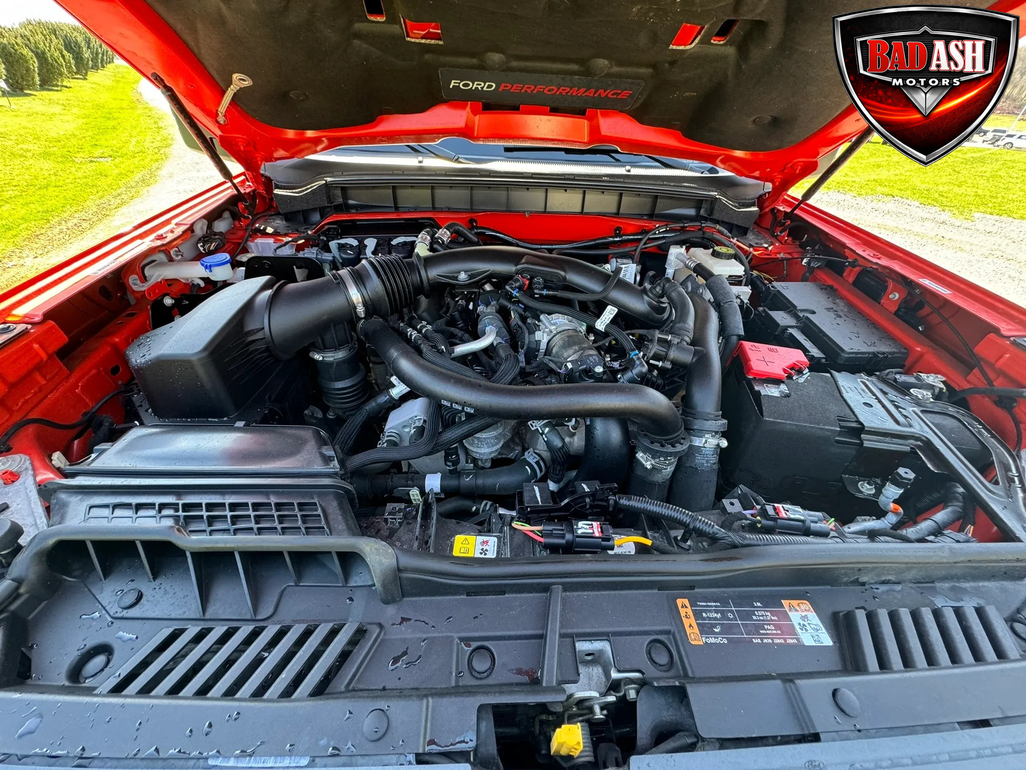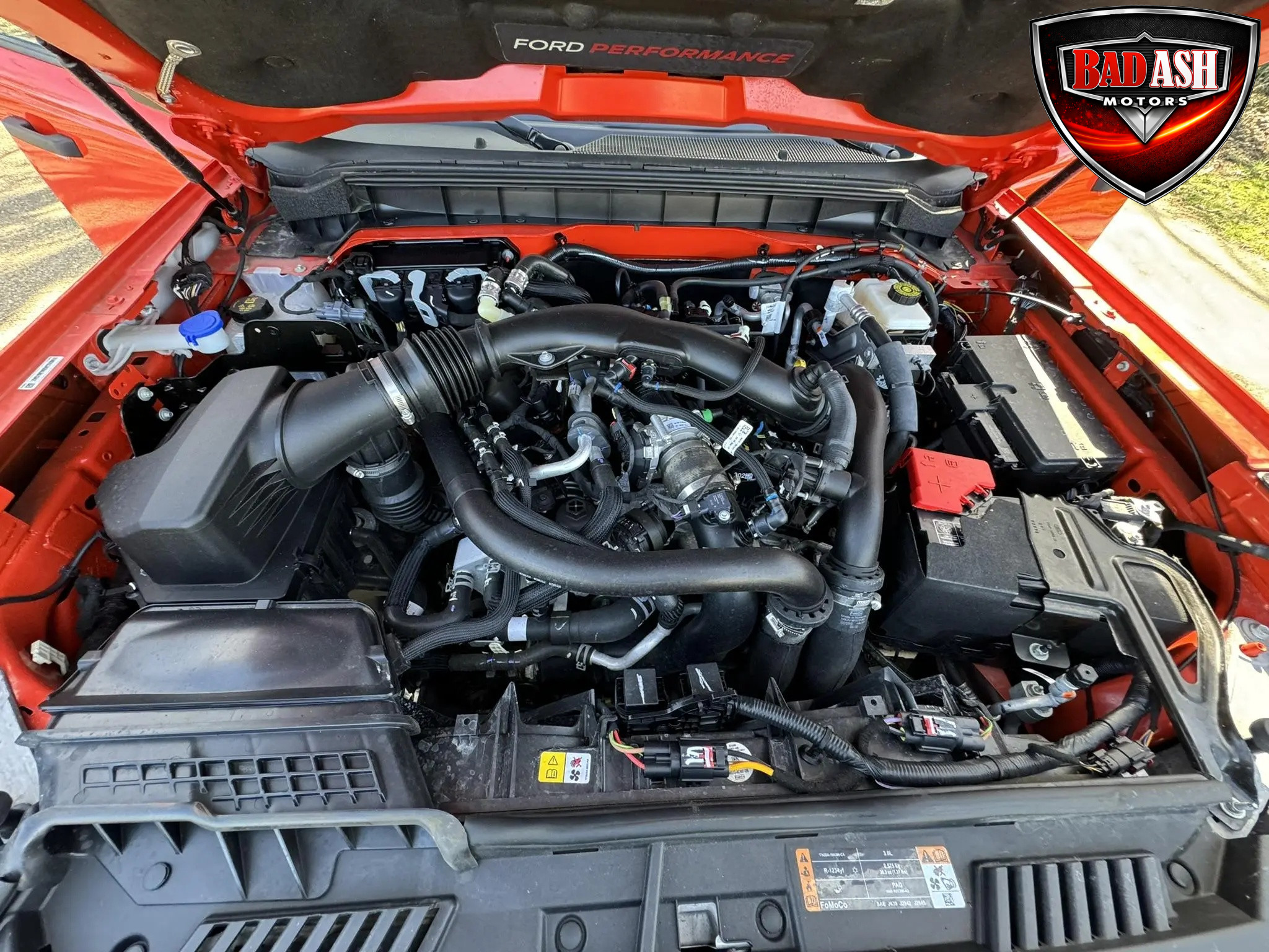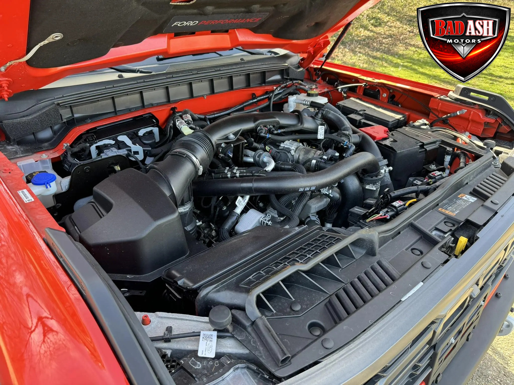 Finished in Code Orange with multi-tone graphics over a Blue and Black Onyx leather and suede interior, this example is equipped with the desirable Lux Package. Performance features include the HOSS off-road suspension with live-valve Fox dampers, Terrain Management System with G.O.A.T. drive modes, front stabilizer bar disconnect, Dana front and rear axles with 4.70:1 gearing, active exhaust, and four-wheel disc brakes. The Raptor’s wider track and increased ground clearance enhance its off-road capability.