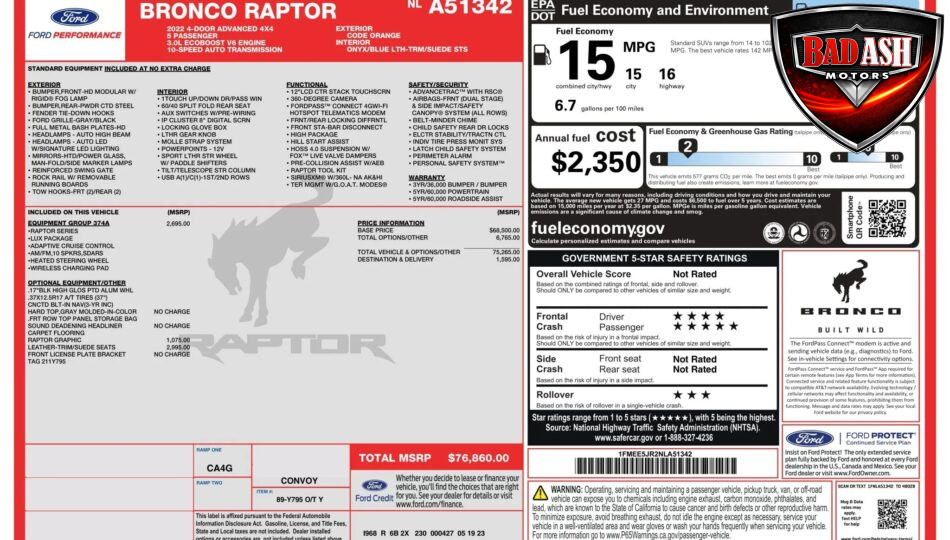 The included Carfax report is clean, showing no accidents or reported damage. This Bronco Raptor represents Ford’s flagship off-road platform, combining advanced technology, rugged capability, and distinctive styling.